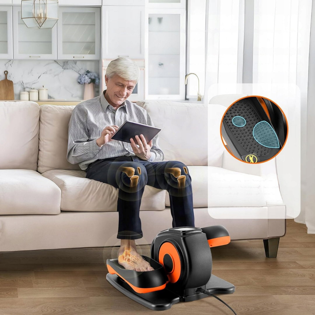 Kompaktowy trenażer eliptyczny to elektryczne urządzenie do ćwiczeń nóg, zaprojektowane z myślą o osobach starszych, pracujących w pozycji siedzącej oraz w trakcie rehabilitacji.