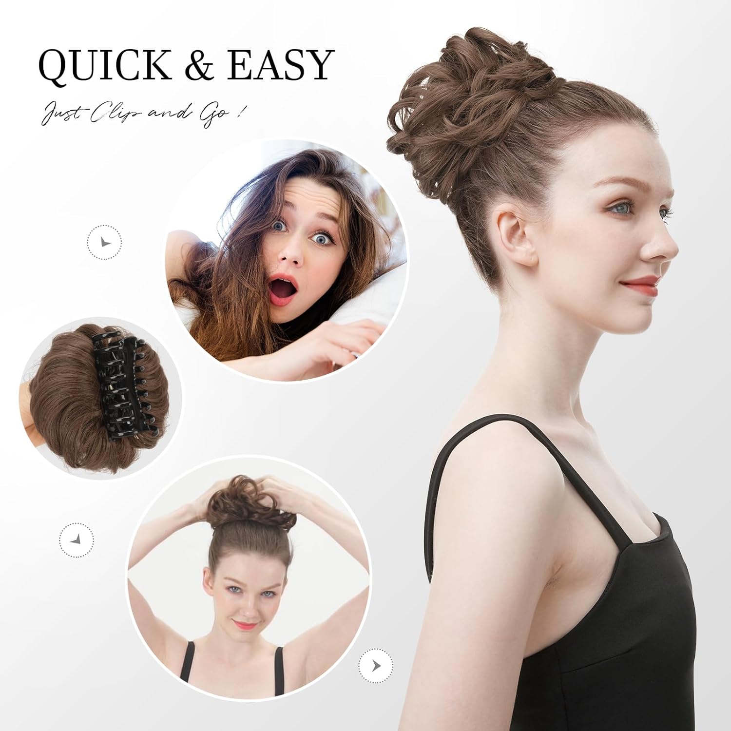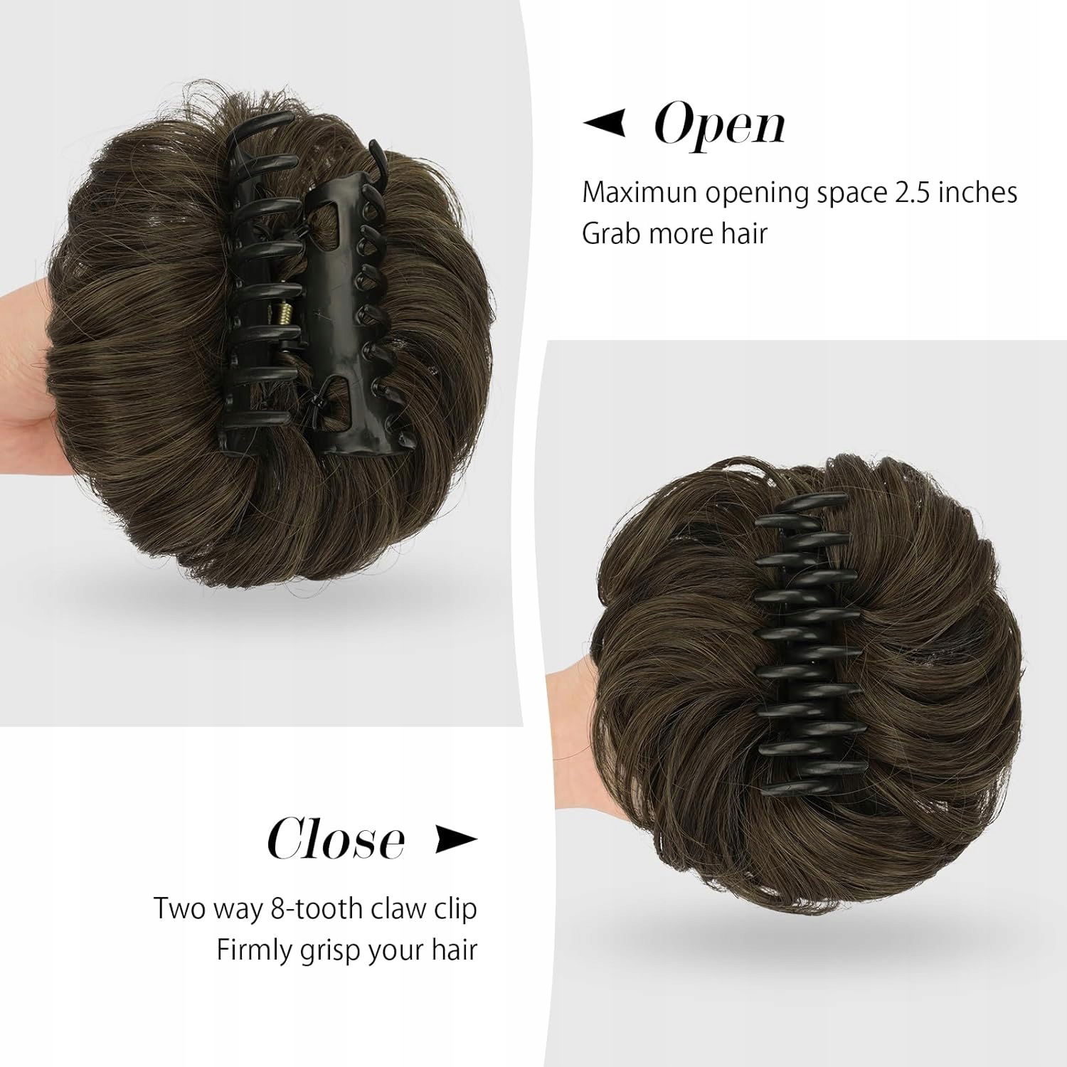 - Konstrukcja scrunchie z kokiem do włosów z klipsem sprawiła, że jest dość łatwy w użyciu. Wystarczy uszczypnąć, aby otworzyć grzebień pazurów przez górną część spinki i przypiąć wlosy do własnych wlosów lub kucyka, tylko jeden krok, a otrzymasz elegancką i relaksującą fryzurę.