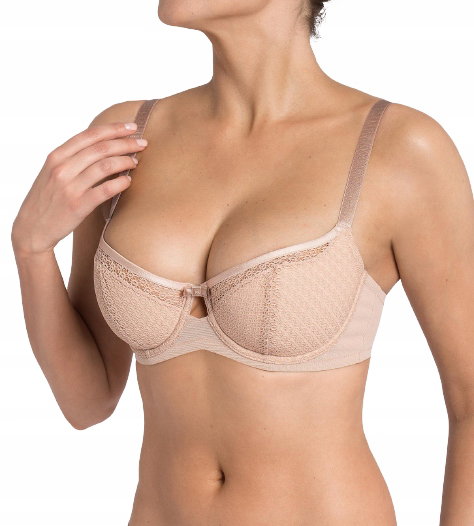 Elegancki biustonosz, idealny na każdą okazję, dzięki swojej prostocie jednocześnie zmysłowy za sprawą ażurowej siateczki o ciekawym wzorze, która pokrywa miseczki i tworzy przezroczyste wykończenie ponad nimi. Łączenie miseczek tworzy niewielką łezkę, którą zdobi kokardka. Boczna część biustonosza gładka, wykonana z wytrzymałej i elastycznej siateczki. 2-rzędowe 3-stopniowe zapięcie oraz szerokie regulowane ramiączka.