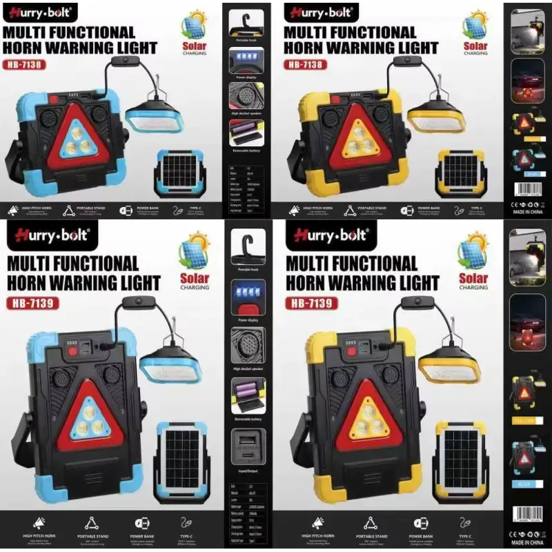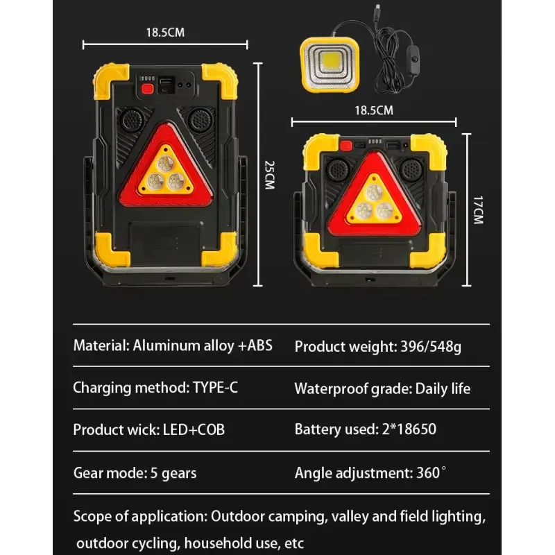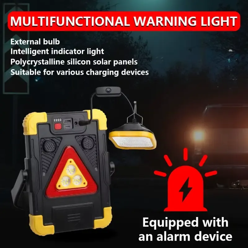 Nowoczesna lampa solarna, wielofunkcyjny samochodowy trójkąt ostrzegawczy, latarka, power bank, lampa zawieszana i światło ostrzegawcze z sygnałem alarmowym, posiada wskaźnik ładowania w zestawie kabelek usb. Idealne akcesorium podróżne do każdego pojazdu, który może być również używane jako światło robocze.