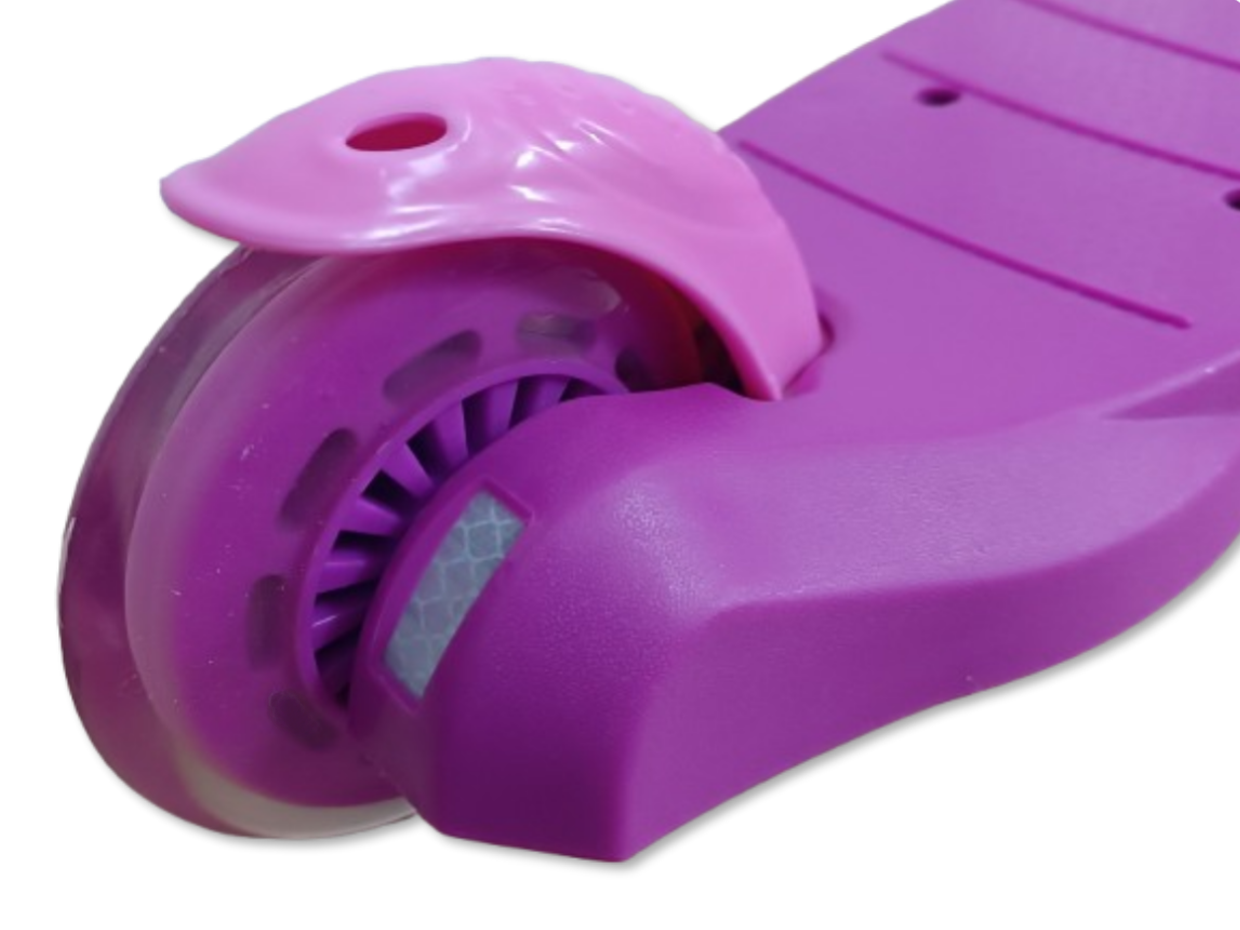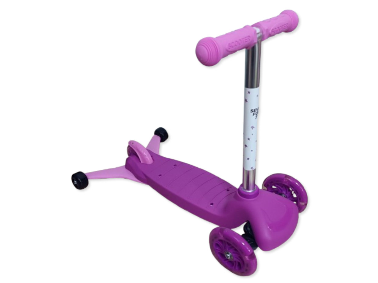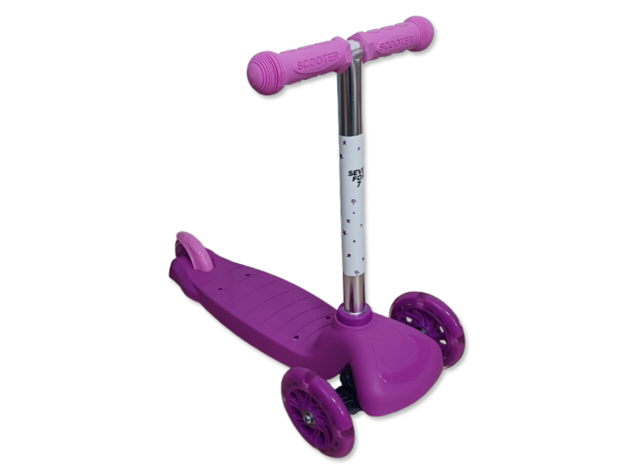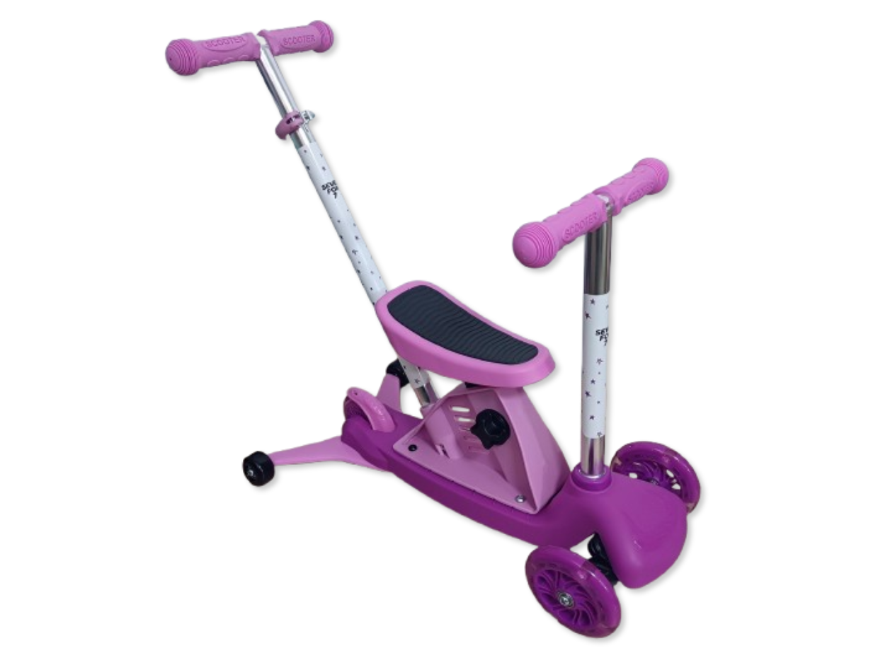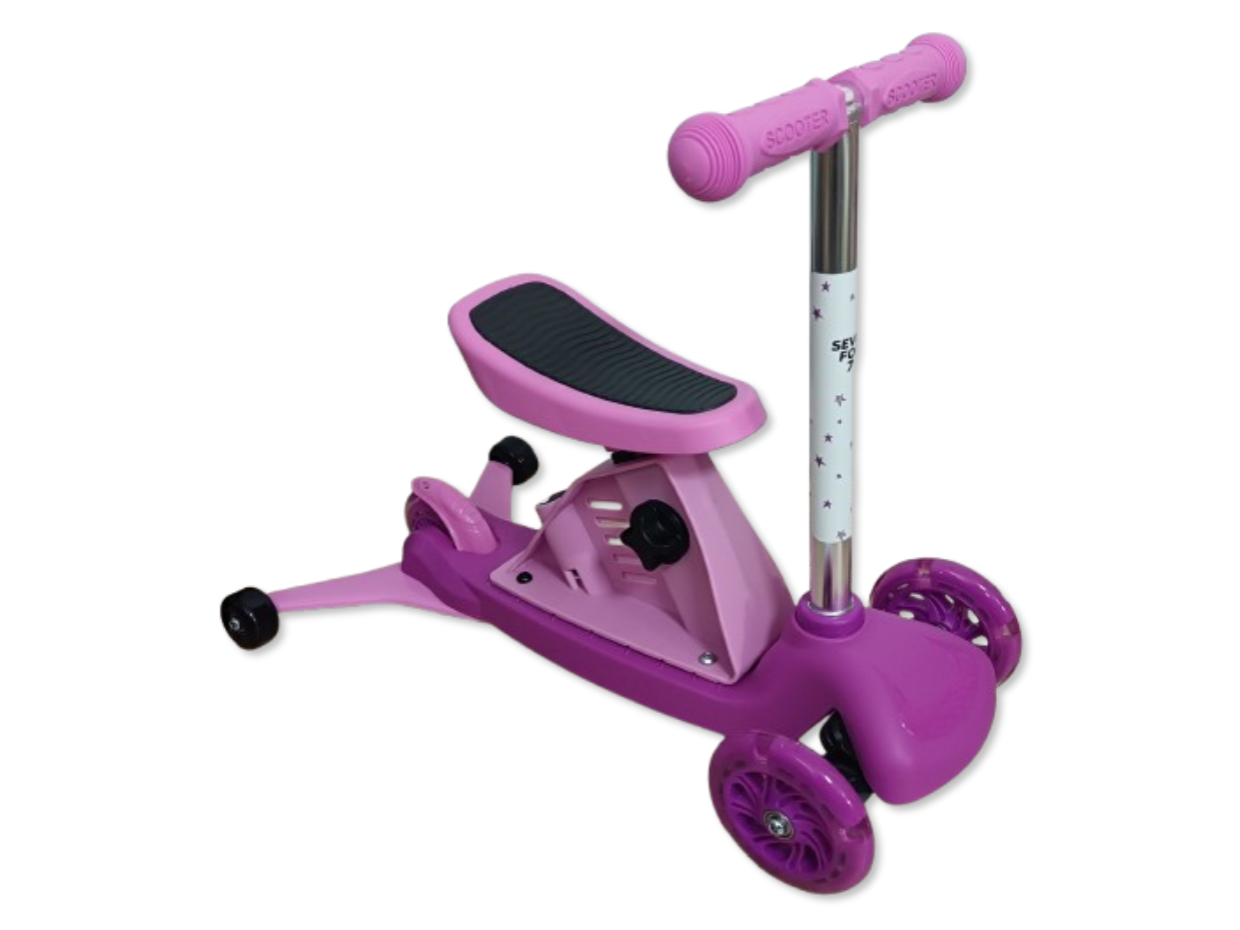 Trójkołowa hulajnoga dla dzieci z LED-owymi świecącymi kółkami marki Seven for Seven przeznaczona jest dla dzieci od 18 miesiąca życia i maksymalnej masie ciała do 50kg. Dzięki możliwości modyfikacji hulajnoga rośnie razem z dzieckiem dzięki czemu można ją dostosować do potrzeb dziecka. W pierwszym etapie hulajnoga posiada doczepiane dwa dodatkowe tylne kółka zapewniające stabilność, regulowane siodełko oraz uchwyt do prowadzenia z trzy stopniową regulacją wysokości. W późniejszym etapie rozwoju dziecka można odczepić uchwyt do prowadzenia pozostawiając siodełko i dwa dodatkowe kółka, dzięki czemu hulajnoga może pełnić funkcję jeździka. Gdy dziecko trochę podrośnie to w kolejnym etapie można zdemontować siedzisko pozostawiając dwa dodatkowe tylne kółeczka, które zapewniają stabilność. W ostatnim etapie można odczepiamy tylne kółeczka i przekształcamy produkt w 3 kołową hulajnogę. Hulajnoga posiada wygodne rączki gwarantujące pewny chwyt, dwa przednie koła o średnicy 12cm i jedne mniejsze z tyłu o średnicy 9,5cm (doczepiane kółka mają średnicę 5cm). Hulajnoga posiada błotnik nad tylnym kółkiem pełniący rolę hamulca i podświetlane przednie koła LED, które świecą się w trakcie jazdy. Produkt poprawia koordynację ruchową, rozwija zdolność utrzymywania równowagi, a także kondycję. Dzięki zastosowaniu trzech kółek produkt jest bardziej stabilny od standardowej hulajnogi, a dodatkowe doczepiane tylne kółka zapewniają większe bezpieczeństwo w początkowych etapach nauki jazdy na hulajnodze.