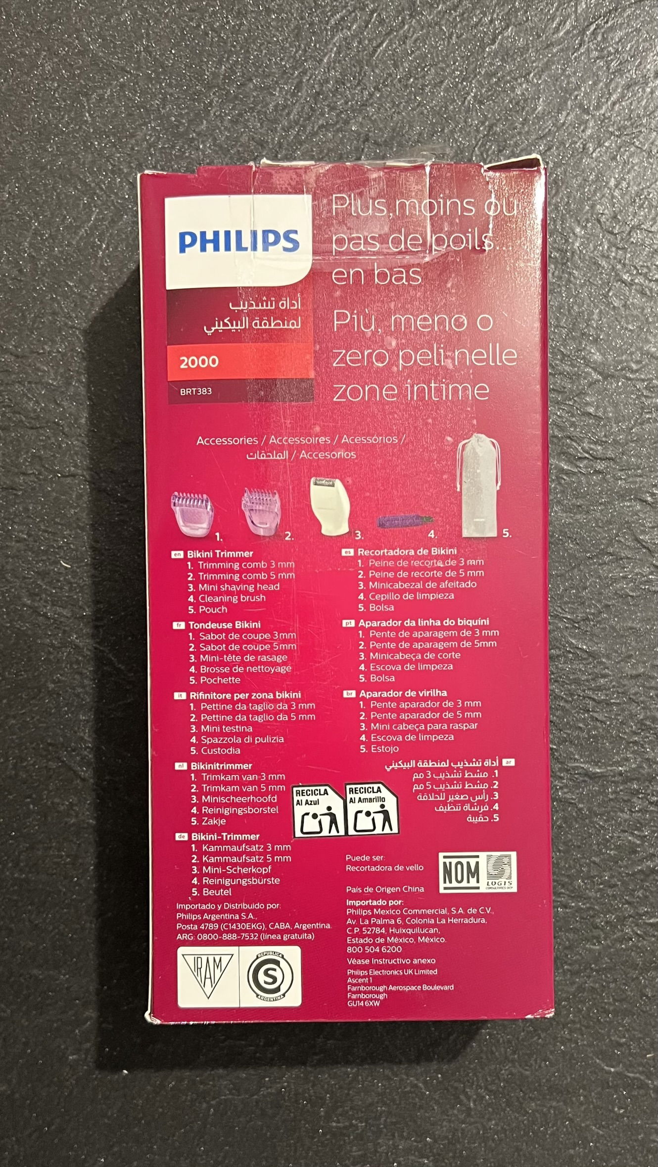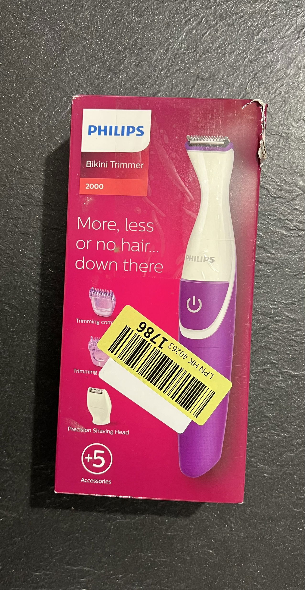 W skład zestawu wchodzi 1 x trymer do bikini Philips Essential, 1 x miniaturowa głowica goląca z zaokrągloną końcówką, 2 x grzebienie Click, 1 x szczoteczka do czyszczenia