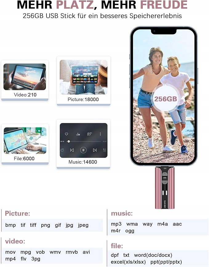TRYVAT Pamięć USB 256 GB do telefonu, USB 3.0, zewnętrzna pamięć masowa, pamięć 4 w 1, pamięć flash, pamięć do telefonów komórkowych z systemem Android / Type-C/Pad/laptopa/komputera/PC, różowa