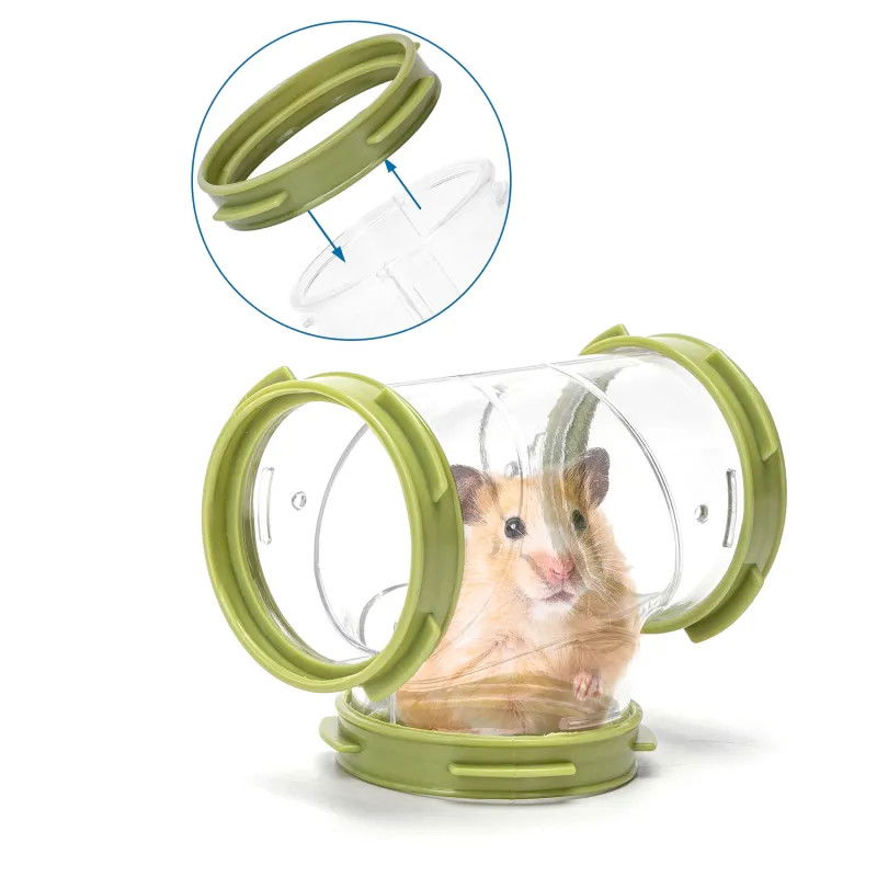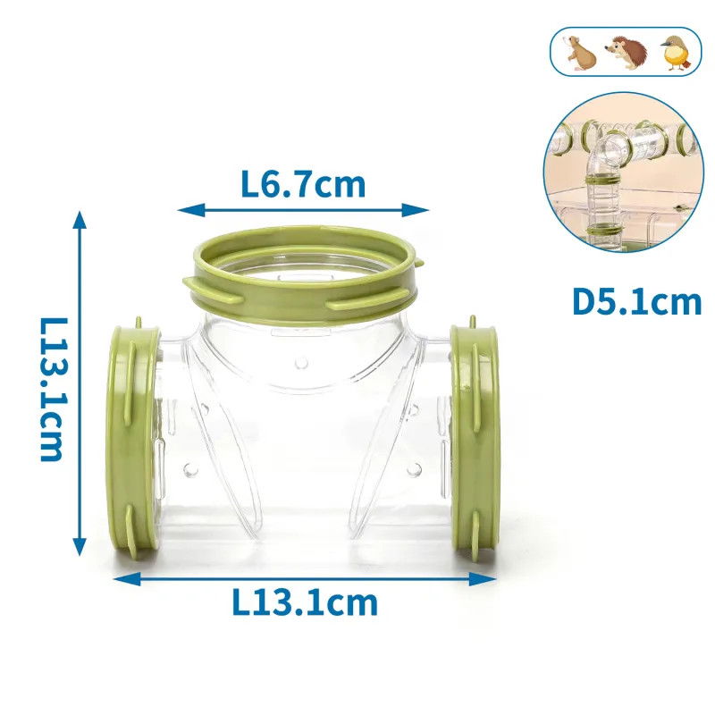 Element tunelu w kształcie litery T, który można łączyć z innymi elementami lub używać samodzielnie, tworząc plac zabaw dla chomików i innych małych gryzoni. Wysokiej jakości proces formowania wtryskowego, cienka, gładka i przezroczysta powierzchnia, pozwala na obserwację.