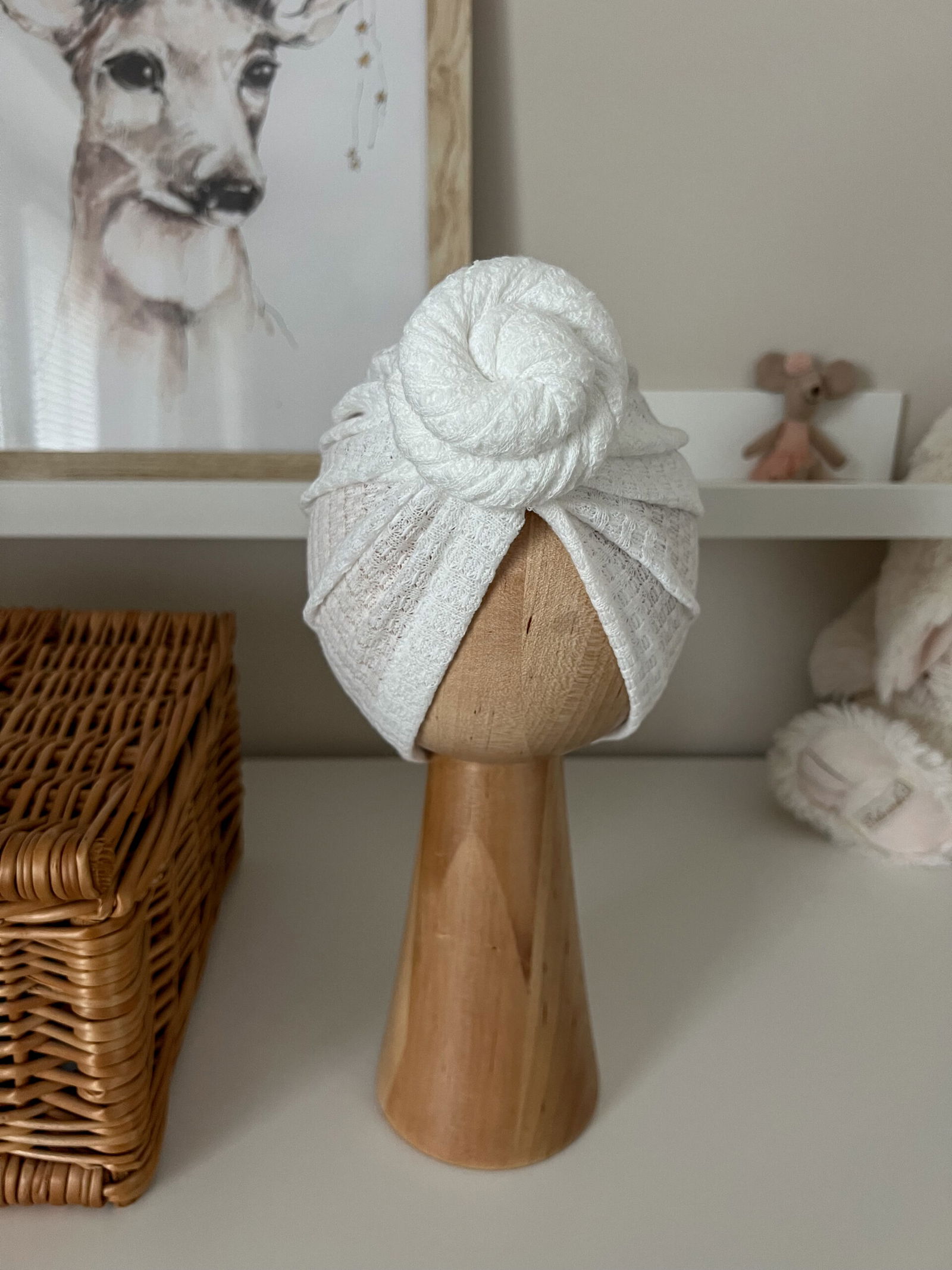 Rozmiar: Drewniana główka prezentująca ma obwód 42 cm co odpowiada standardowo rozmiarowi dla dziecka 3-6 mc