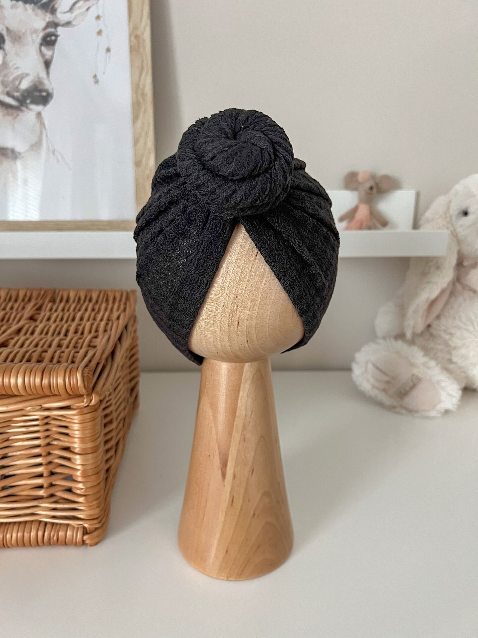 Rozmiar: Drewniana główka prezentująca ma obwód 42 cm co odpowiada standardowo rozmiarowi dla dziecka 3-6 mc