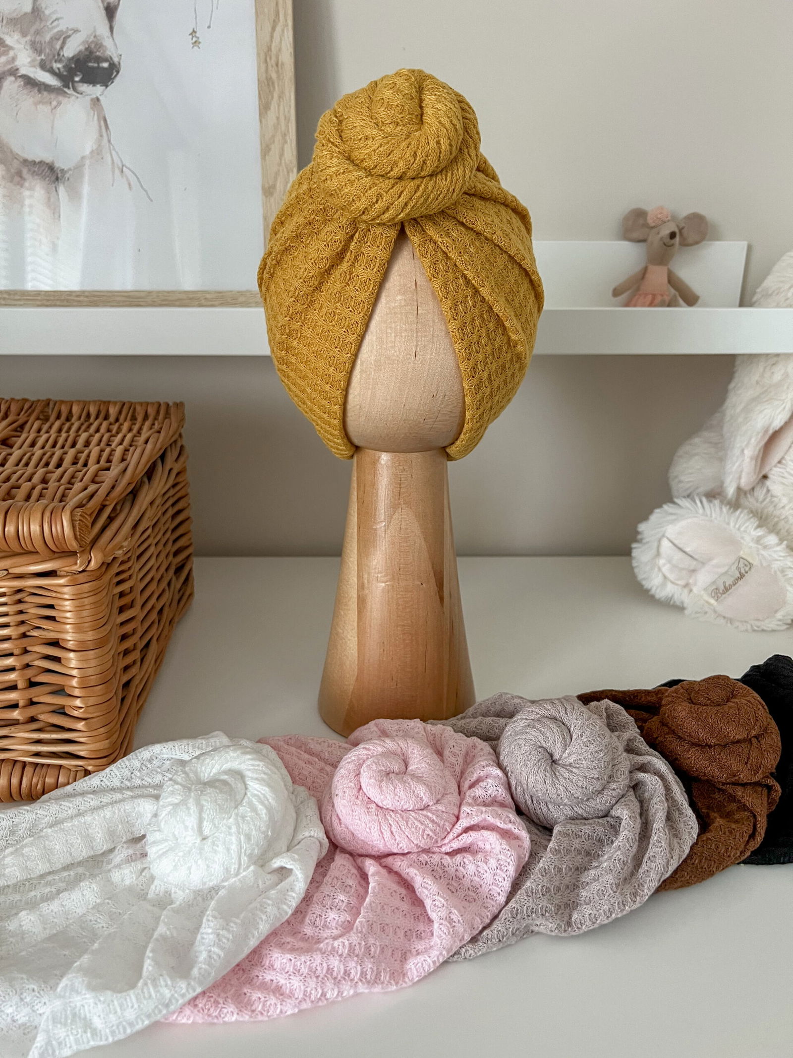 Rozmiar: Drewniana główka prezentująca ma obwód 42 cm co odpowiada standardowo rozmiarowi dla dziecka 3-6 mc