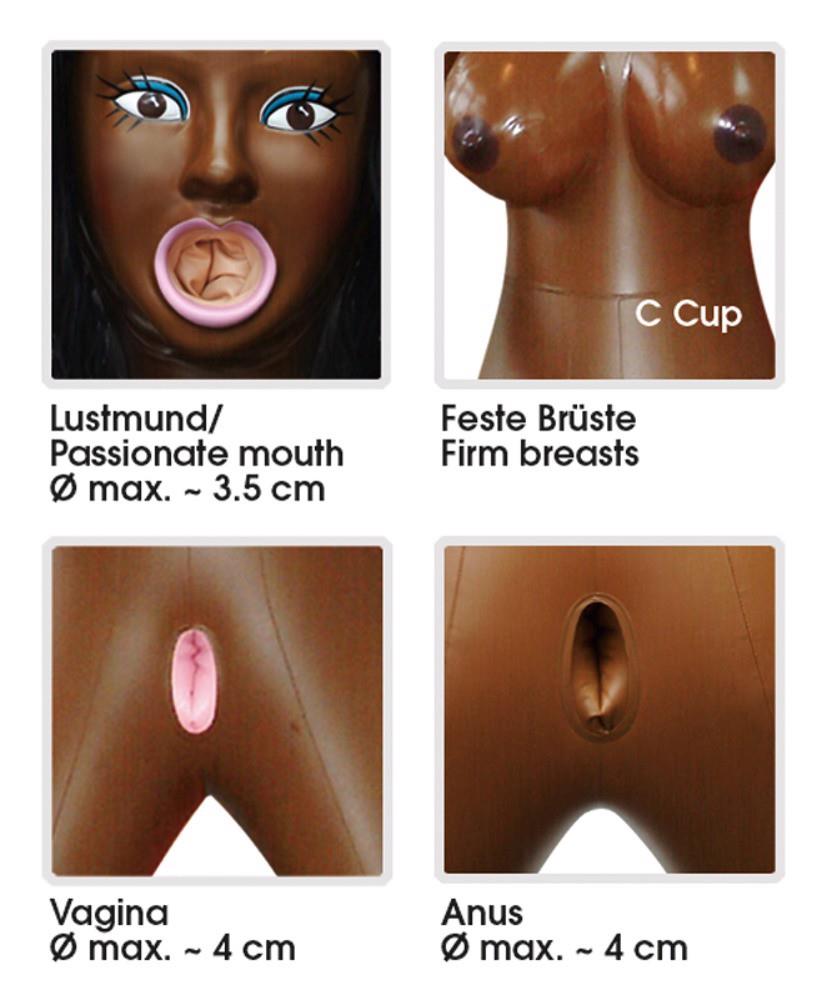Rozmiar 152 cm. Obwód: klatka piersiowa 92 cm, talia 62 cm, biodra 78 cm. Otwory rozkoszy - głębokość wejścia (węższe): Usta 11,5 cm, średnica maks. 3,5 cm Pochwa 11 cm, średnica maks. 4 cm Odbyt 10 cm, średnica: maks. 4 cm. PVC.