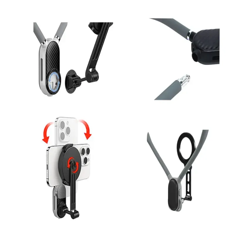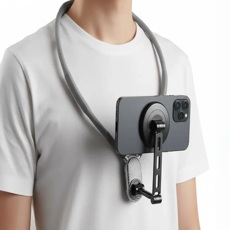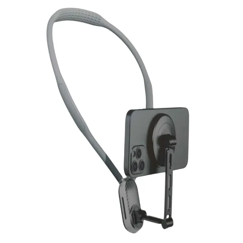 Magnetyczny uchwyt na telefon pozwala wygodnie korzystać ze smartfona bez trzymania go w dłoni. Elastyczna konstrukcja zakładana na szyję stabilnie utrzymuje urządzenie przed użytkownikiem, dzięki czemu możesz nagrywać filmy, prowadzić transmisje lub oglądać treści bez konieczności używania rąk.