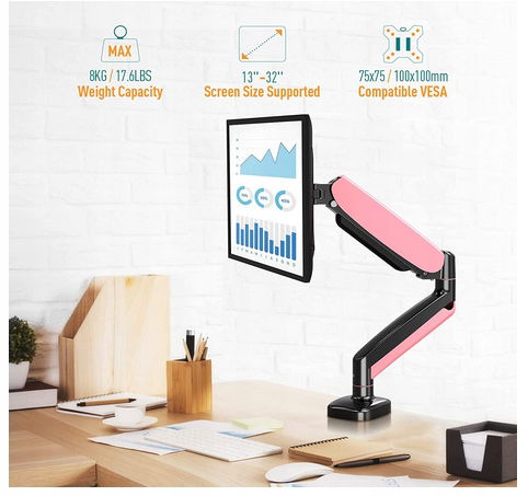 Kompatybilność — ramię ze sprężyną gazową jest w stanie utrzymać większość płaskich i zakrzywionych monitorów o przekątnej od 13 do 32 cali ze standardem VESA 75 x 75 mm lub 100 x 100 mm i wadze do 8 kg. Jest kompatybilny z różnymi markami, takimi jak HP, Dell, ASUS, Samsung, LG, Acer, Philips, MSI, BenQ, Lenovo, Gigabyte, Electriq, ToLuLu, Alienware, iiyama itp.