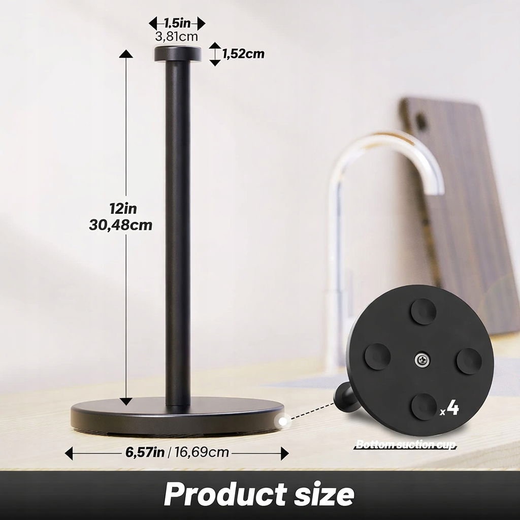Przyssawki w podstawie: od spodu podstawy znajdują się 4 przyssawki, aby utrzymać uchwyt na ręczniki papierowe w stabilnym stanie ponadto ułatwia to oderwanie papieru jedną ręką. Dodatkowo przyssawki chronią blat mebla przed zarysowaniem
