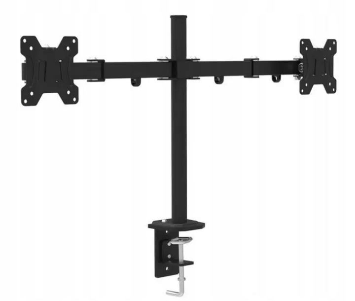 Mocny stalowy uchwyt biurkowy z podwójnym ramieniem – montuje dwa ekrany obok siebie, aby wygodnie zwolnić miejsce na biurku. Mieści dwa telewizory lub monitory 13-27" o maksymalnej nośności 10 kg na każde ramię