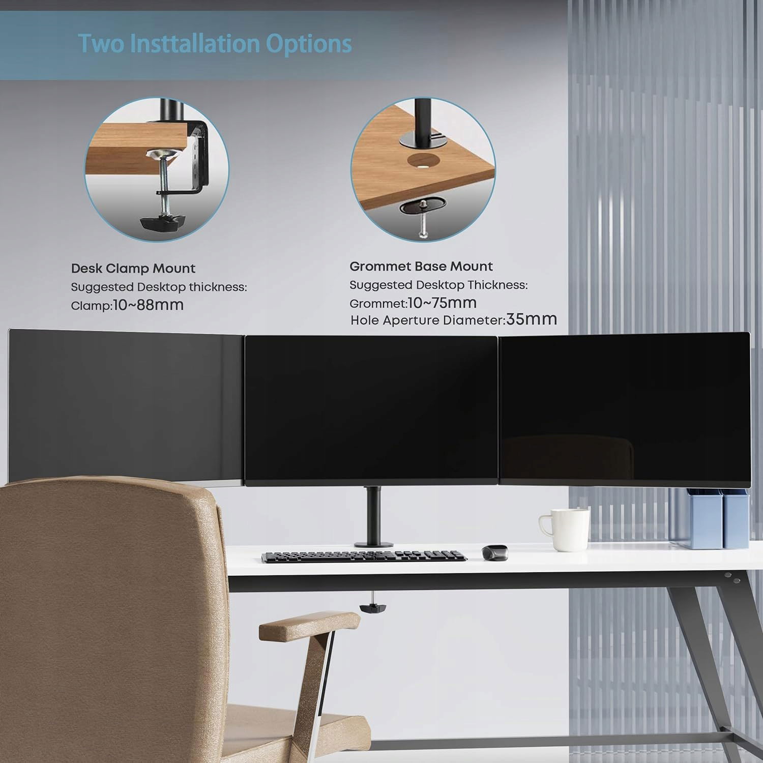 PUTORSEN MAS-3 to solidny, metalowy uchwyt stołowy do trzech monitorów o przekątnej od 13" do 27", każdy o wadze do 7 kg. Montaż odbywa się za pomocą zacisku C lub podstawy oczkowej – w zależności od potrzeb i dostępnej przestrzeni na biurku. Uchwyt kompatybilny ze standardem VESA 75x75 oraz 100x100 mm.