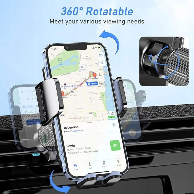 Elastyczny obrót o 360 °: Ten uchwyt na telefon samochodowy jest wyposażony w obrotową kulkę kulową o 360°, która pomaga obracać uchwyt samochodowy poziomo i pionowo. Nie blokuje wzroku i można go łatwo regulować jedną ręką, aby zapewnić najlepszy kąt widzenia bez zakłócania widzenia podczas jazdy. Możesz przeglądać, odbierać połączenia i szczęśliwie odtwarzać muzykę w samochodzie.