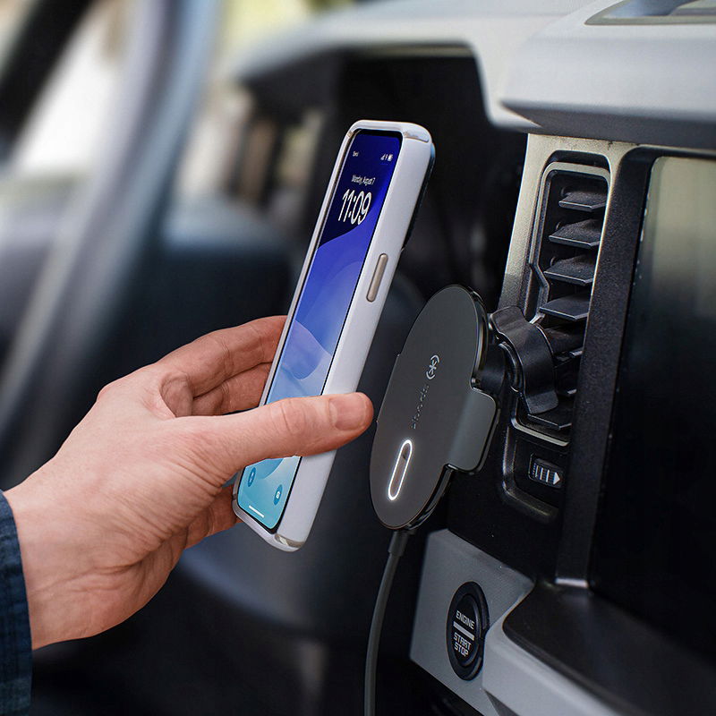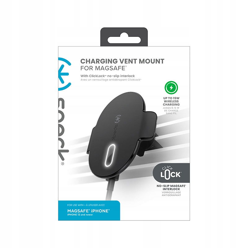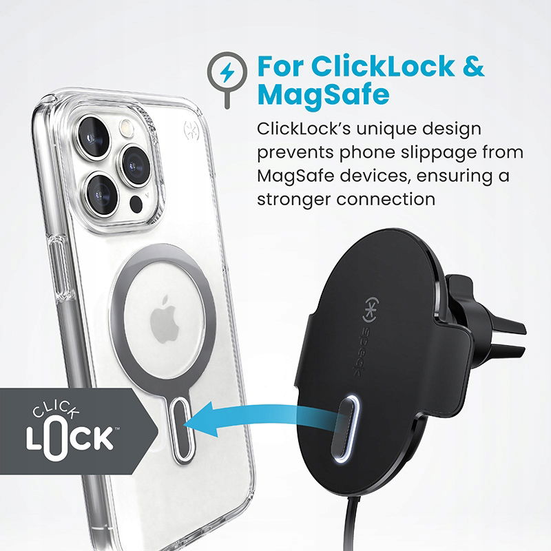 Speck Charging Vent Mount + ClickLock ™ to wyjątkowo bezpieczny, regulowany w zakresie 360° uchwyt samochodowy z ładowaniem bezprzewodowym MagSafe ®, mocowany do kratki nawiewu, dedykowany dla modeli iPhone serii 16/15/14/13/12.