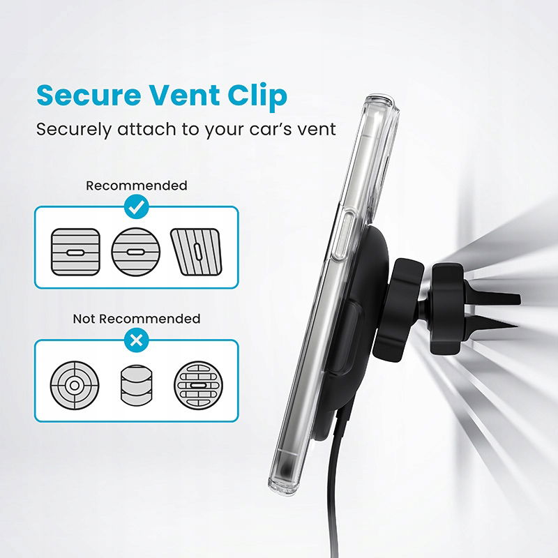 Uchwyt pasuje do większości standardowych otworów wentylacyjnych w samochodach. Działa również z etui MagSafe® innych renomowanych marek.