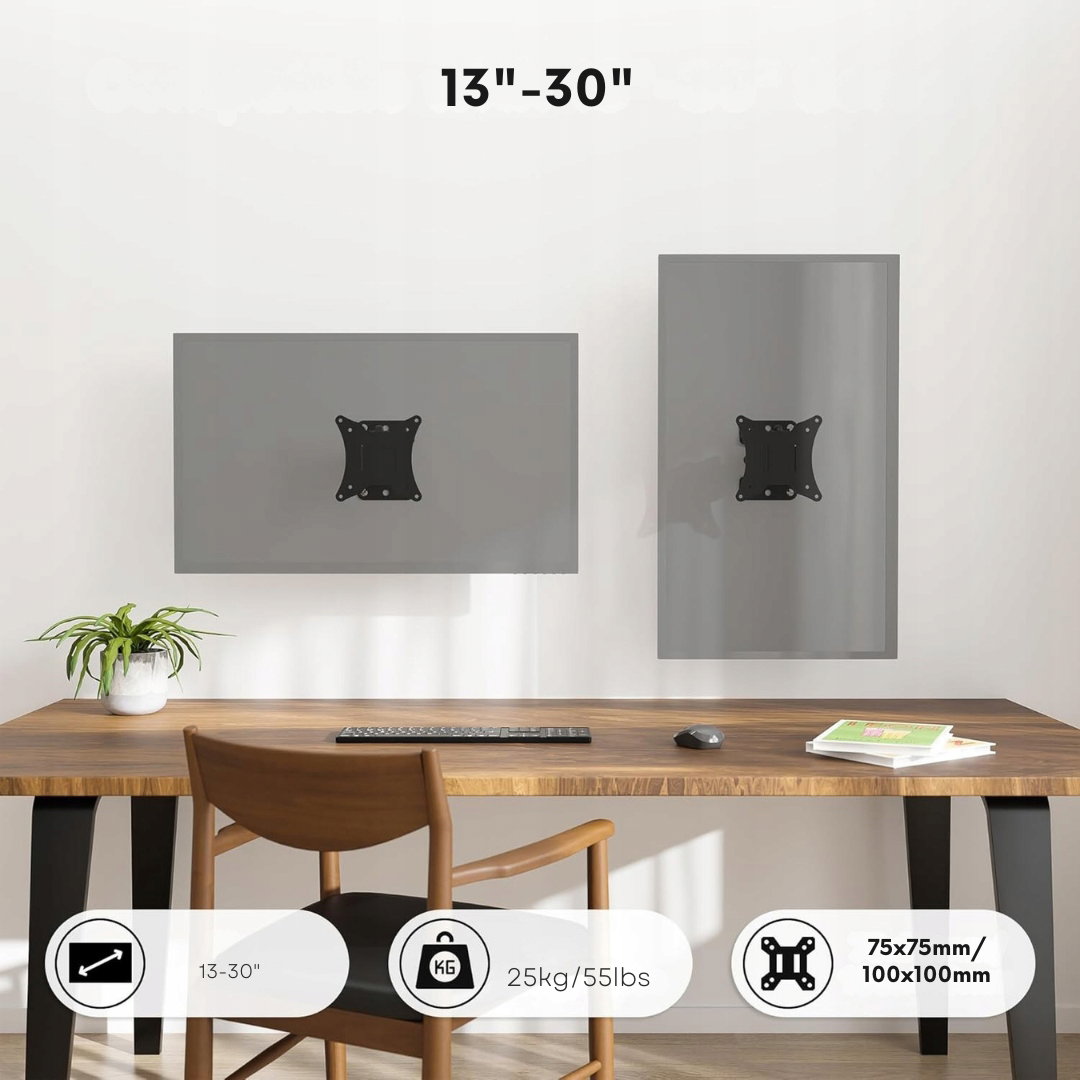 - Uniwersalna kompatybilność: uchwyt pasuje do ekranów o przekątnej 13-30 cali i wadze do 25 kg (w tym LED, LCD oraz plazmowych.) Doskonale sprawdza się w salonach, biurach i sypialniach, oferując szerokie możliwości zastosowania oraz wygodę użytkowania. Kompatybilny z VESA o wymiarach 75 x 75 mm lub 100 x 100 mm.