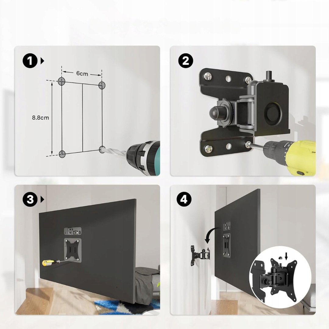 - Zastosowanie: uchwyt służy do montażu telewizora lub monitora na ścianie, umożliwiając regulację kąta widzenia oraz oszczędność miejsca. Zapewnia stabilne i bezpieczne mocowanie ekranu, dopasowując się do różnych powierzchni montażowych. Ułatwia komfortowe ustawienie pozycji ekranu w salonie, biurze, kuchni czy innych pomieszczeniach. Uchwyt nie jest przeznaczony do montażu wyłącznie na ścianach kartonowo-gipsowych. Wymaga stabilnej powierzchni, takiej jak ściany betonowe, ceglane lub drewniane, aby zapewnić bezpieczne i trwałe mocowanie telewizora.