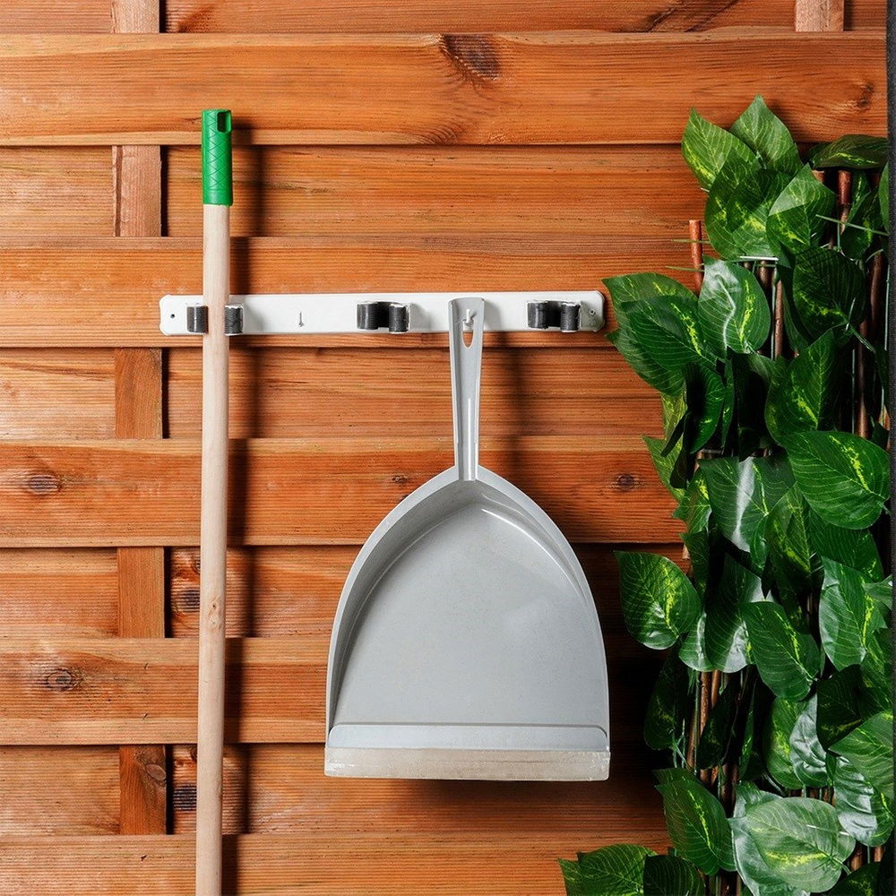 PRZYDATNY - Posiada trzy miejsca do powieszenia narzędzi oraz dodatkowo dwa haczyki na ręcznik czy ścierkę. Wieszak doskonale sprawdzi się do uporządkowania różnych narzędzi ogrodowych oraz domowych, takich jak np. szczotka, miotła, grabie czy mop.