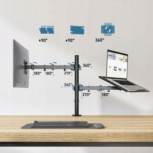 - ✴️Regulacja Ruchu i Wysokości dla Optymalnego Komfortu: Wysokość uchwytu monitora regulowana od 0 do 425 mm, co pozwala na dostosowanie ekranu do poziomu oczu. Długość ramion (410 mm) z pełnym zakresem ruchu – Nachylenie ±90°, Obrót ±90°, i Rotacja 360° – umożliwia pełną personalizację ustawienia monitora i laptopa.