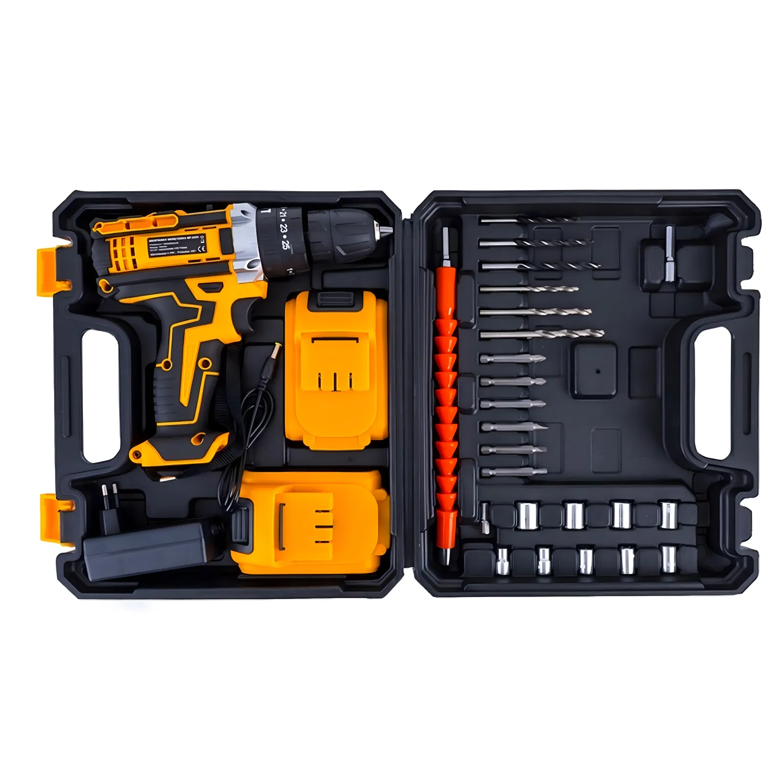 Znajdziesz 6 wierteł, 6 bitów, 9 nasadek, elastyczny przedłużacz oraz ładowarkę.