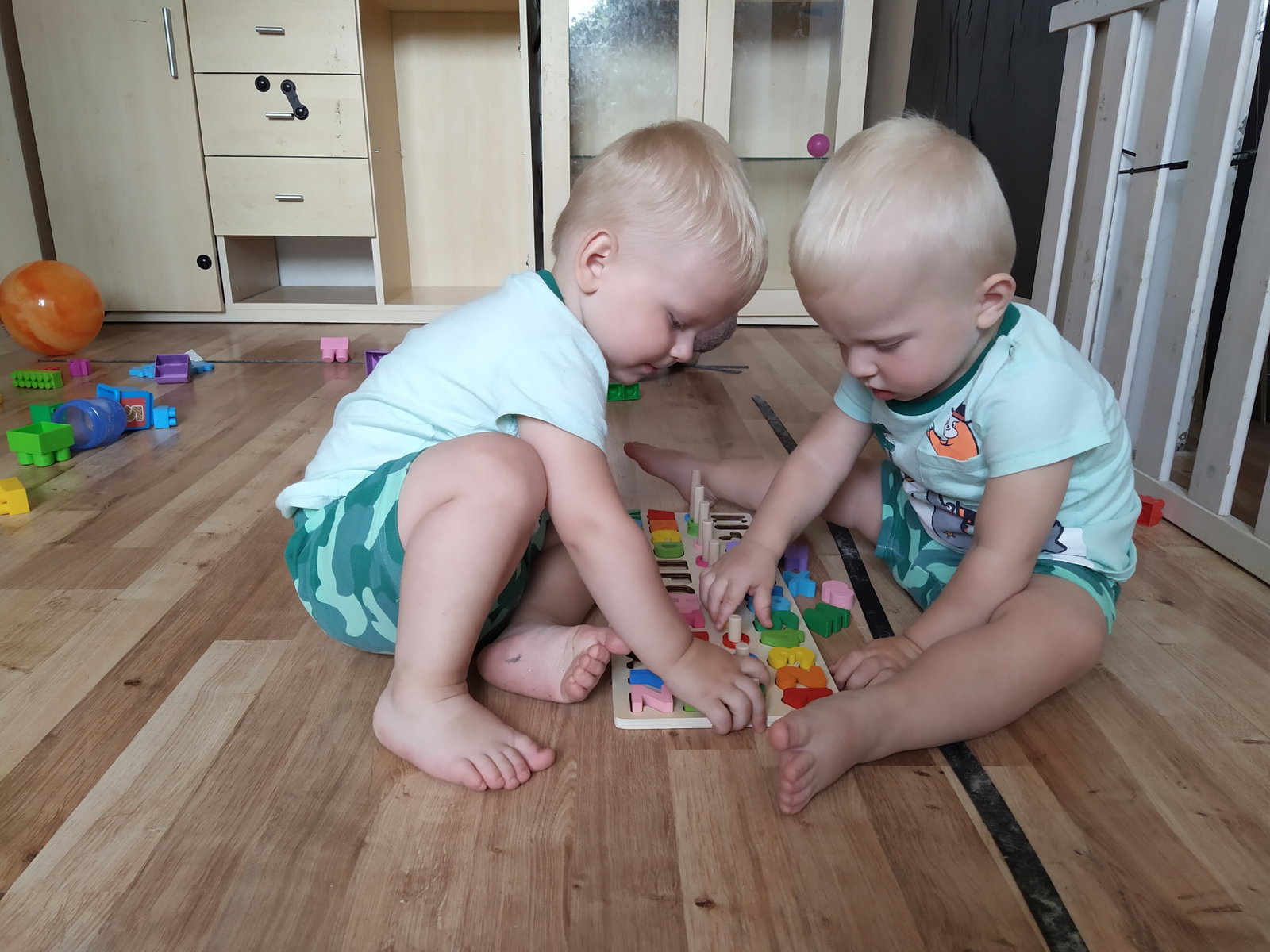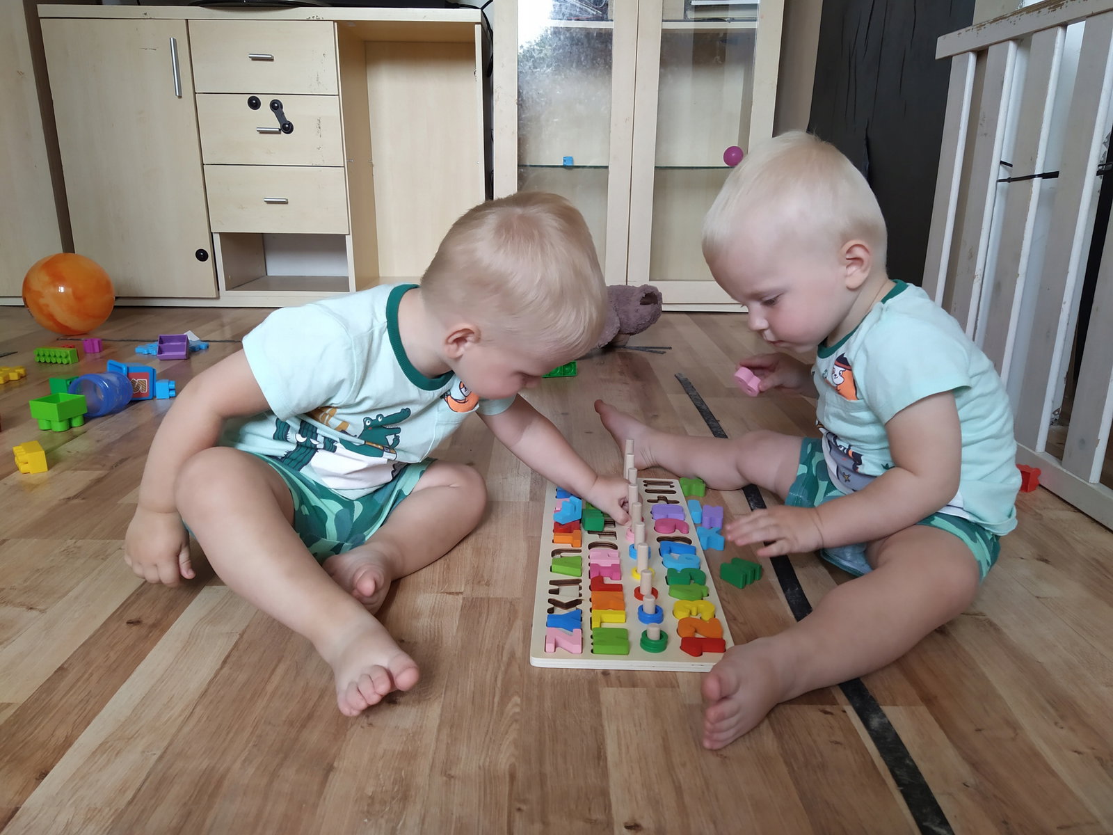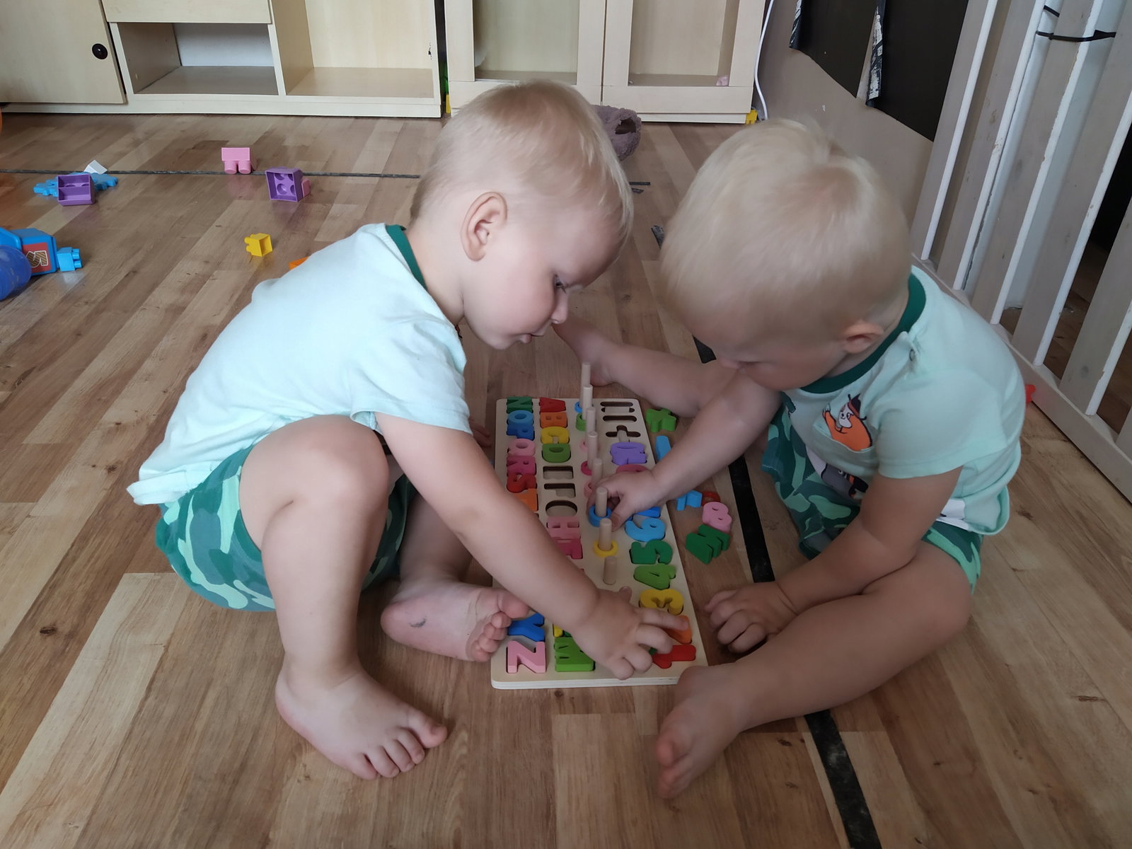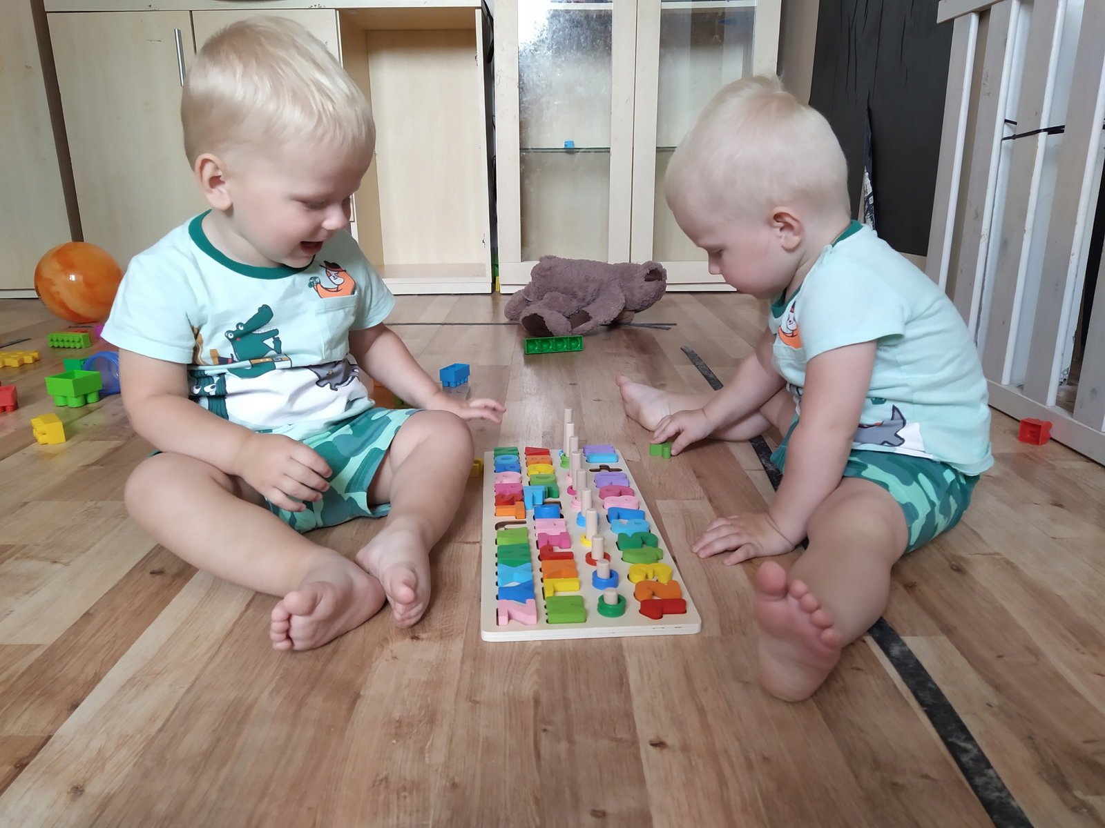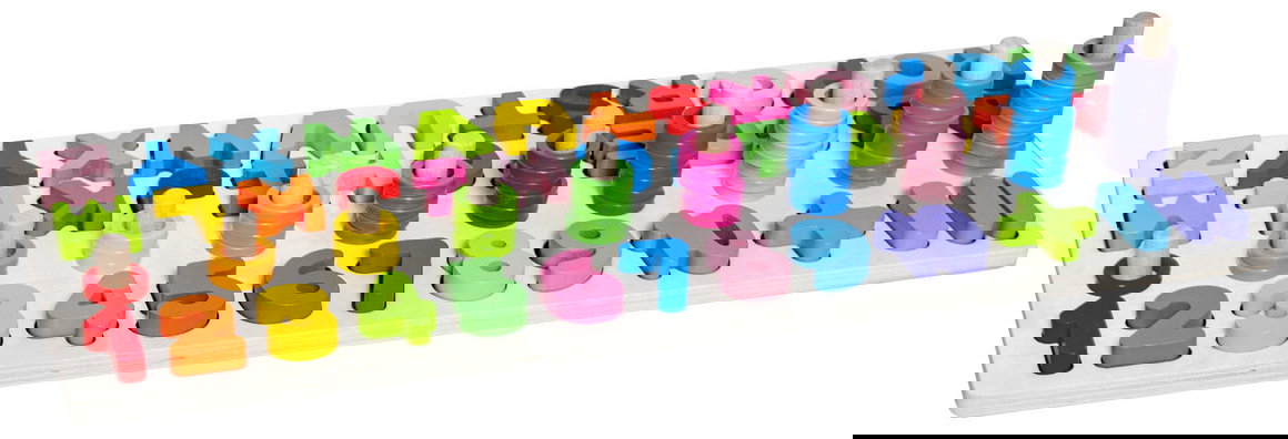 - UKŁADANKA ALFABET I CYFERKI – zestaw składa się z drewnianej deseczki, w której znajduje się cały alfabet oraz cyferki, które posiadają swoje odpowiedniki w postaci kijków z odpowiednia ilością kółeczek. Można ja wyjmować i dopasowywać. Wszystko ułożone zostało w odpowiedniej kolejności od pierwszej do ostatniej literki alfabetu oraz od najmniejszej do największej liczby.