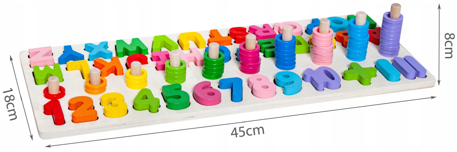 - SPECYFIKACJA – kolor: wielokolorowy; materiał: drewno/ plastik; wymiary(dł/szer/wys):45x18x8cm; waga: 0,80kg; waga w opakowaniu: 0,95kg