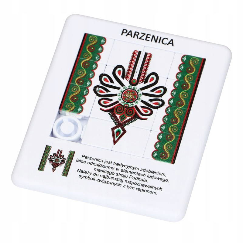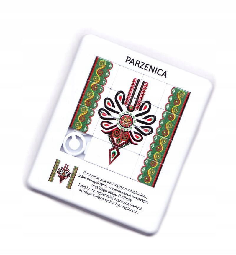 Zabawka dla starszych dzieci od 6 roku. Świetnie nadaje się na prezent oraz jako układanka edukacyjna w szkole. Przedstawia barwny, ludowy wzór parzenicy z Podhala oraz jej opis.