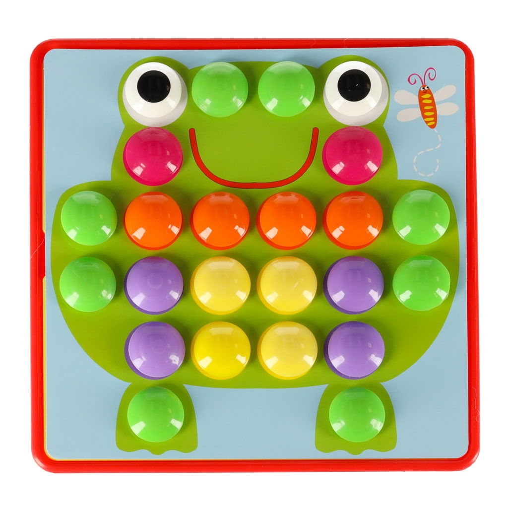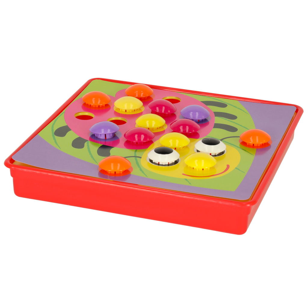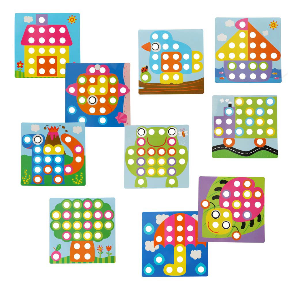Układanka edukacyjna to gwarancja udanej zabawy dla każdego dziecka! W zestawie znajduje się 10 plansz z obrazkami i 46 kolorowych guzików.