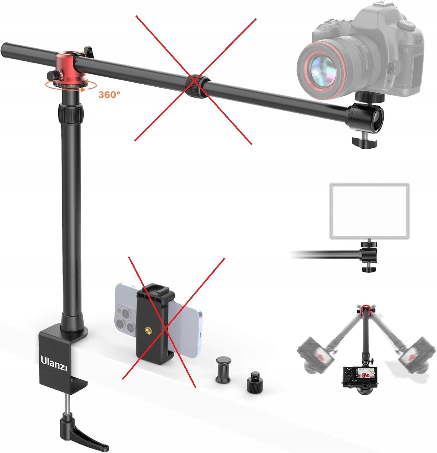 Uniwersalny statyw stołowy ULANZI MT-88, idealny do transmisji na żywo, spotkań online, vlogowania i nagrywania z telefonu, kamer internetowych lub lustrzanek. Dzięki klipsowi montażowemu typu "clip-on", bez problemu przymocujesz go do blatu biurka, stołu czy regału. Statyw posiada standardowy gwint 1/4".