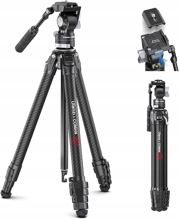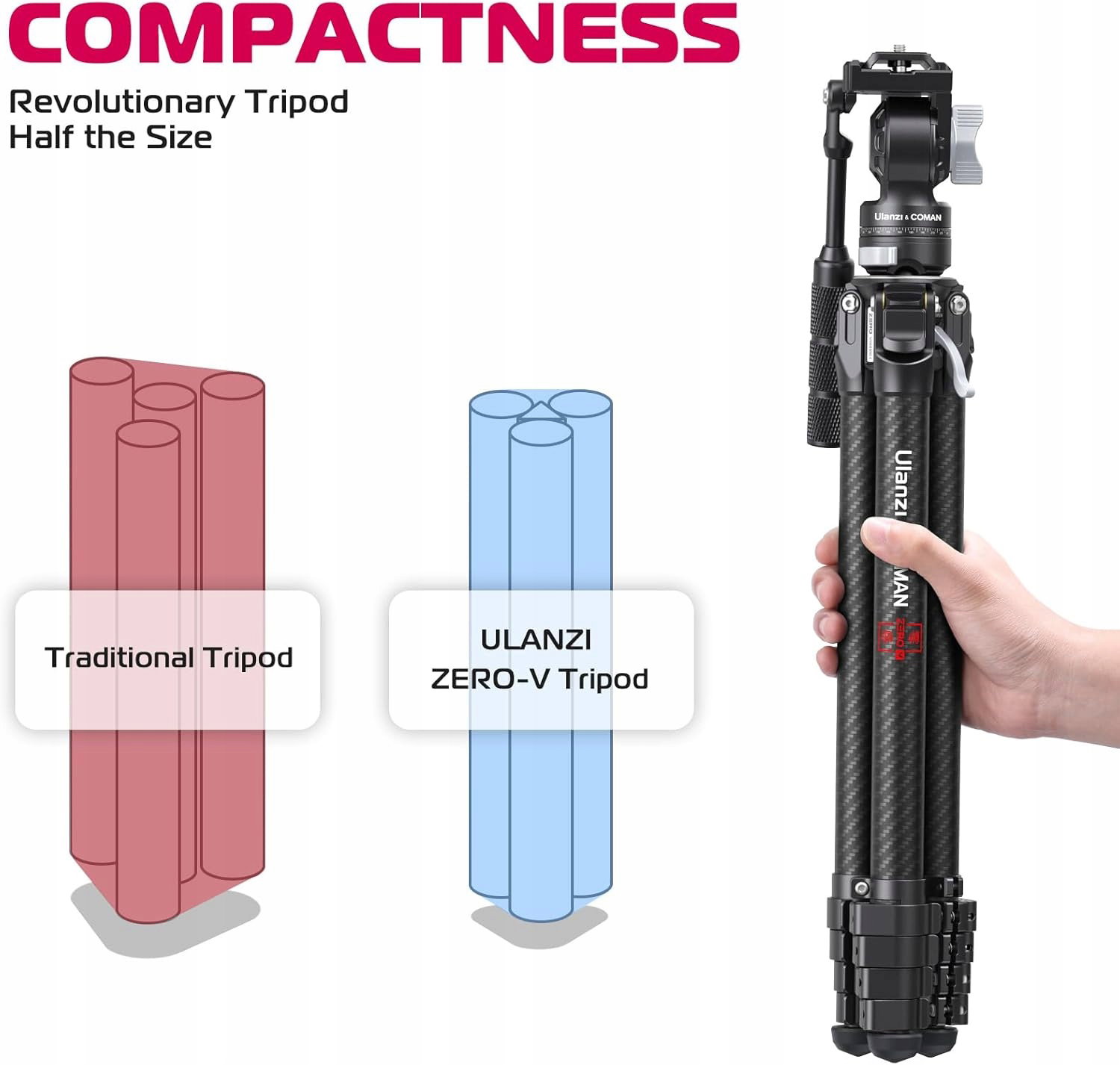 ULANZI Zero V Video Travel Tripod, 157,5 cm/62" statyw wideo z panoramiczną głowicą fluidową 360° i płytą do szybkiej wymiany, zdejmowana kolumna środkowa, statyw podróżny z włókna węglowego do kamer