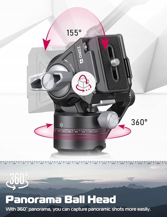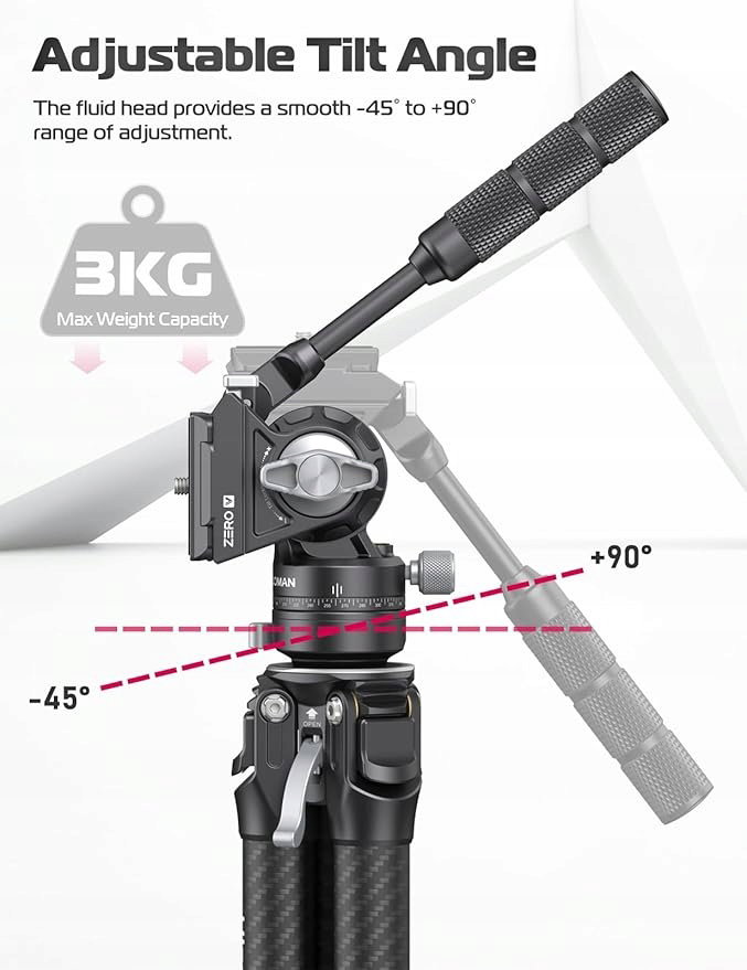 - ▶【Panoramiczna głowica płynna 360°】Dzięki stałemu poziomowi tłumienia głowica statywu wideo Zero V zapewnia odpowiednie napięcie dla płynnych ruchów 90°/-45° i obracania o 360° kamery.