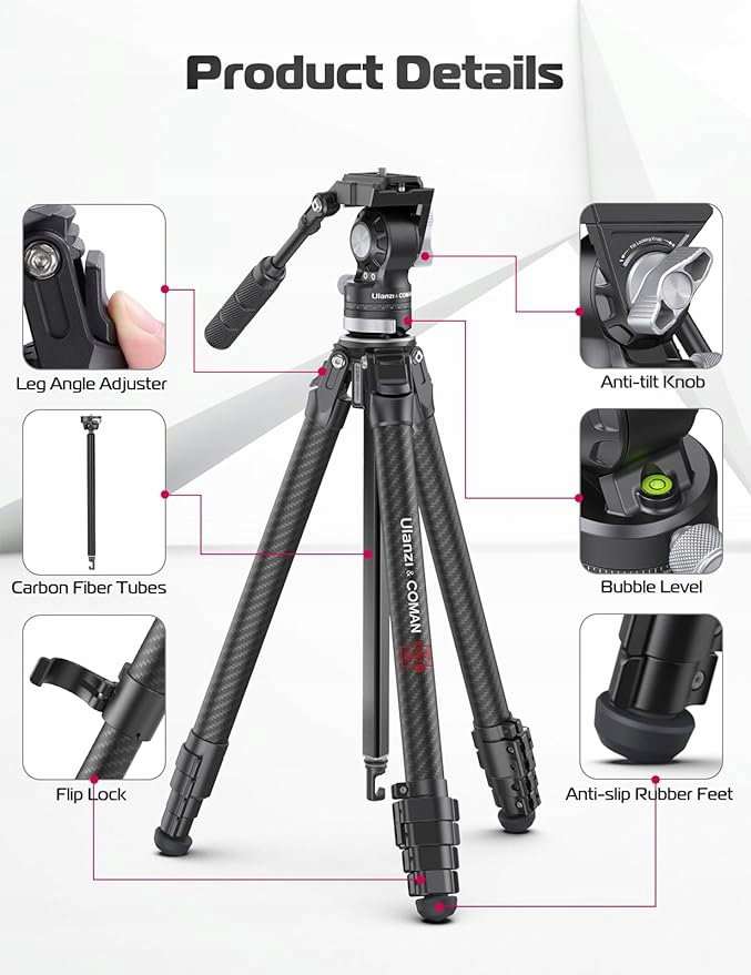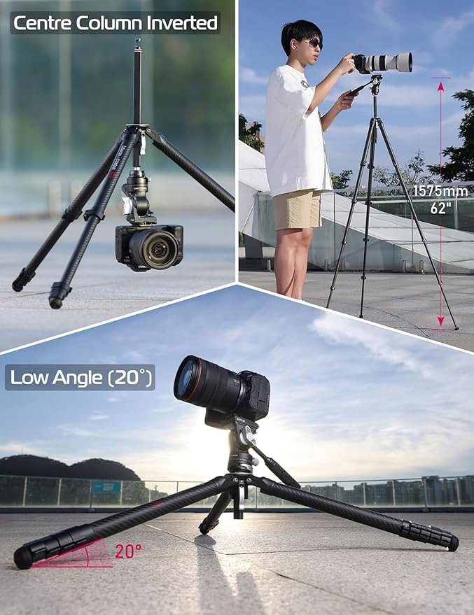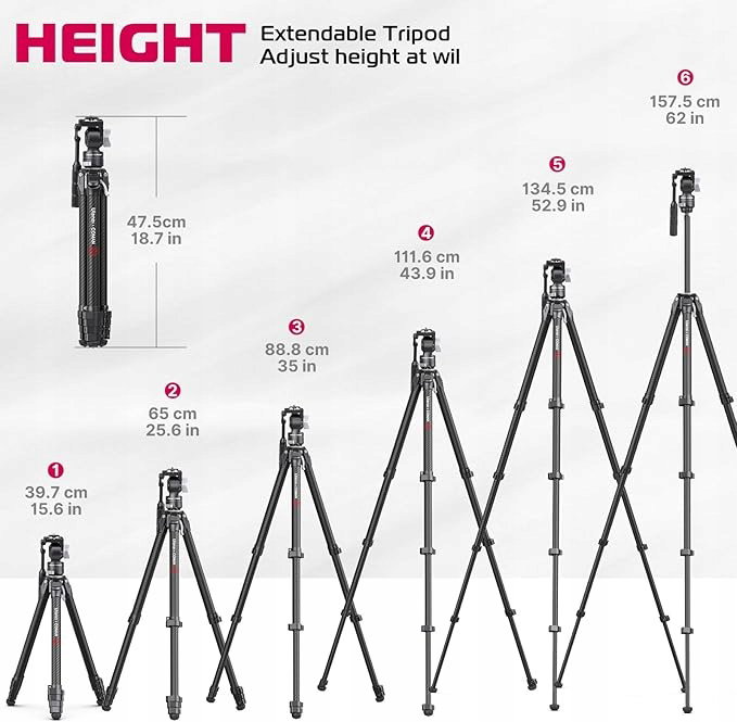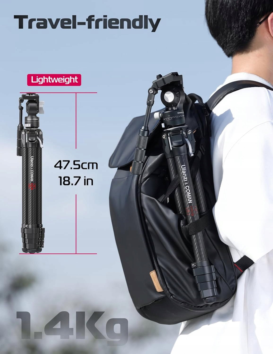 - ▶【Lekka i przenośna】Konstrukcja z włókna węglowego, lekka waga 1,4 kg, wysokość przechowywania 47,5 cm/17,7 cm, łatwa do przenoszenia. Wspaniały towarzysz podróży fotografów.