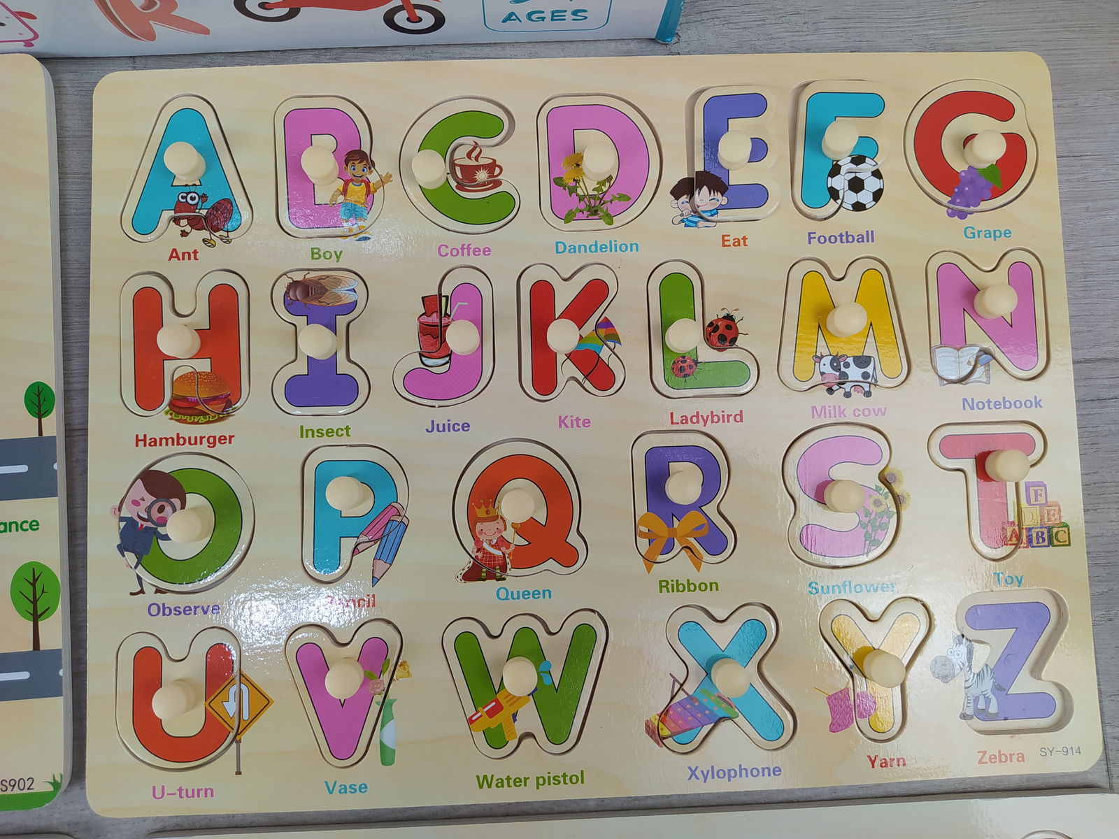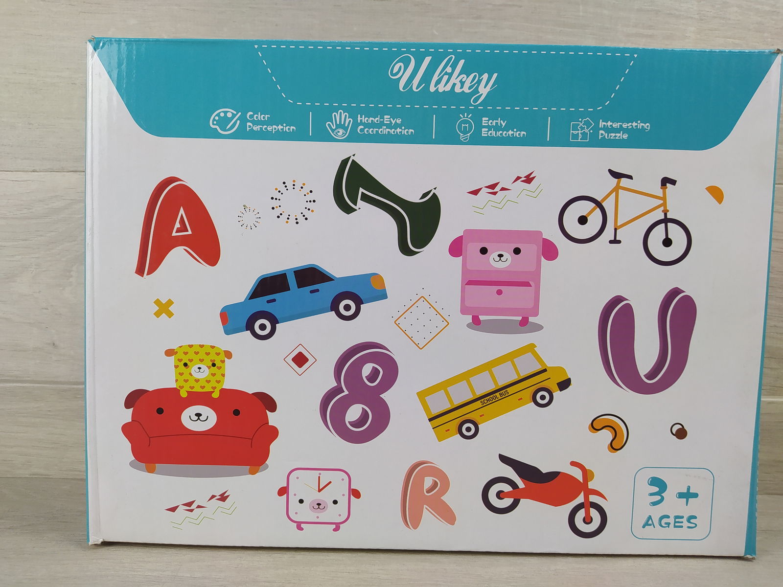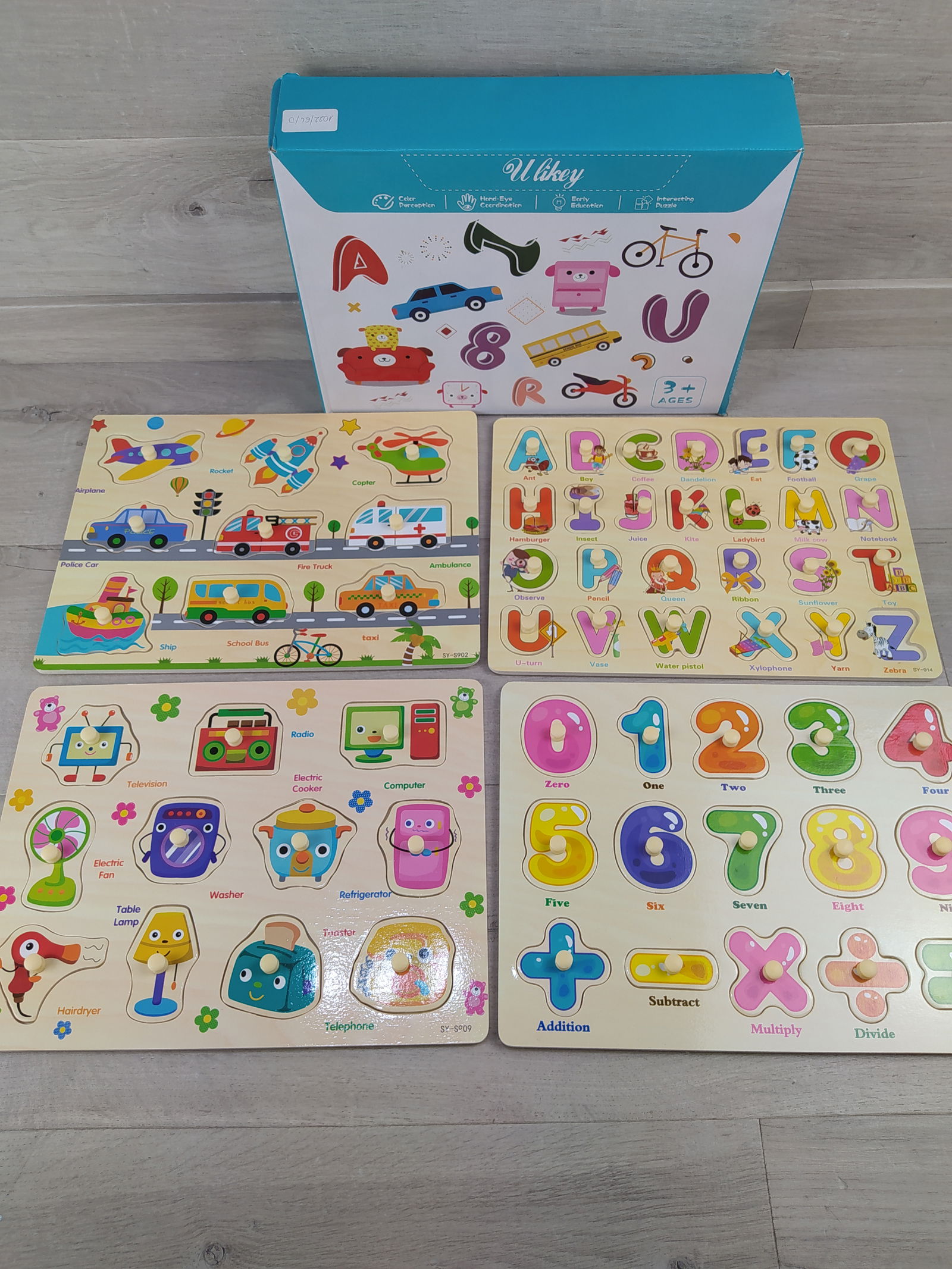 Ulikey drewniane puzzle edukacyjne 4w1 alfabet liczby pojazdy 3+ Język angielski