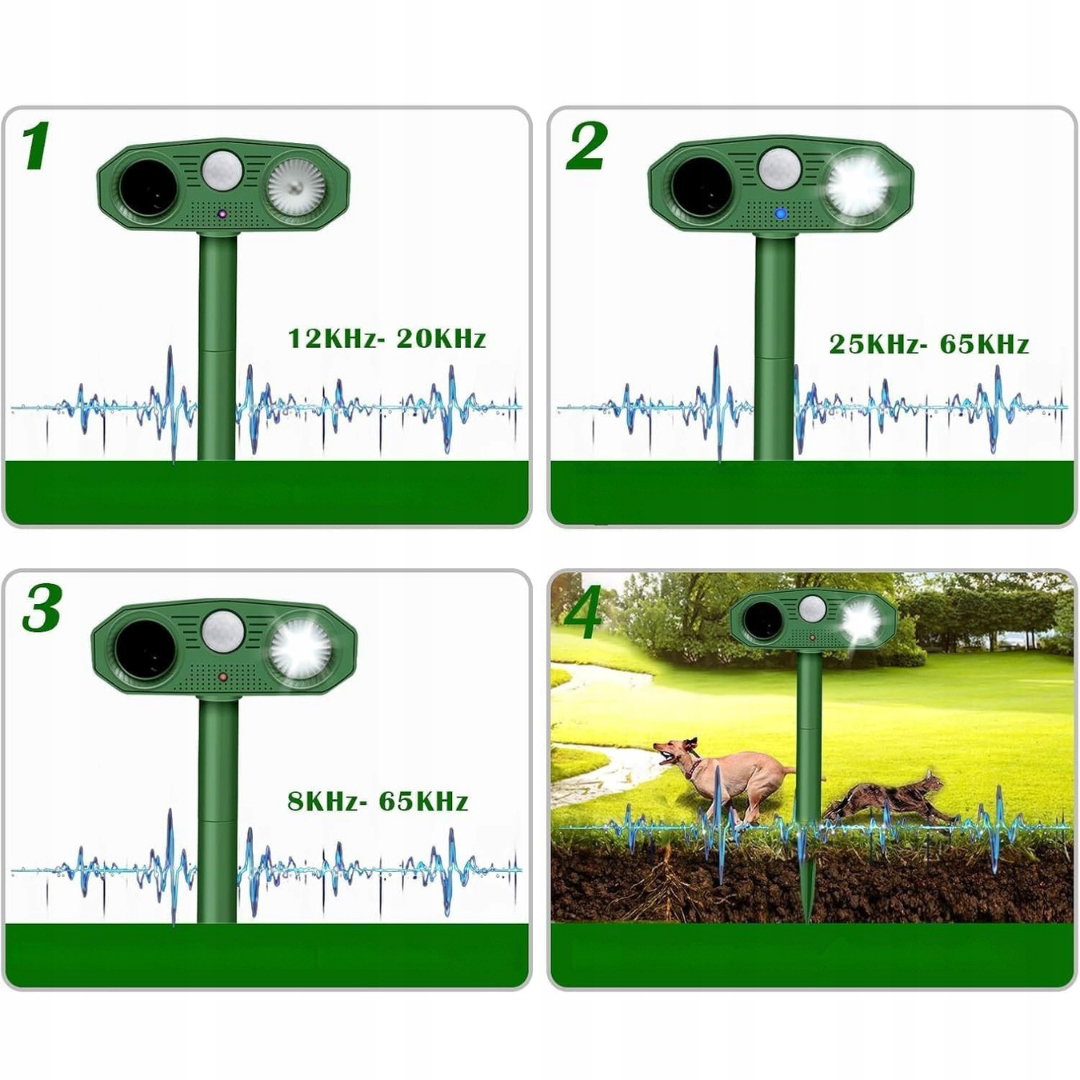 Wykorzystuje fale dźwiękowe o zmiennej częstotliwości, które skutecznie odstraszają koty, psy, gryzonie i inne niepożądane zwierzęta.