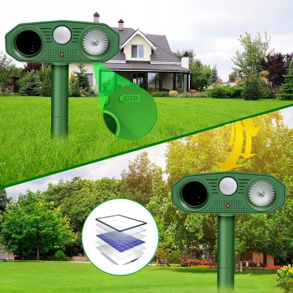 Solarny ultradźwiękowy odstraszacz kotów, 3 tryby, zasilanie solarne i USB, wodoodporny IP64, do ogrodu, skuteczny na koty, psy, myszy i inne zwierzęta.