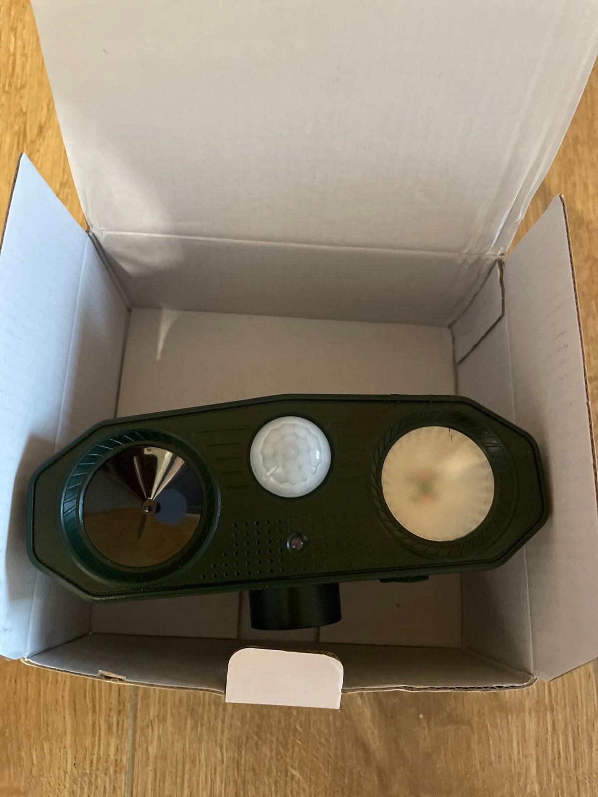 - Czujnik ruchu PIR: urządzenie wyposażone jest w czujnik podczerwieni o kącie detekcji do 120° i zasięgu do 8 metrów. Po wykryciu ruchu emituje silne ultradźwięki oraz błyski LED, które w sposób humanitarny odstraszają zwierzęta, powodując u nich dyskomfort i zniechęcając do zbliżania się.