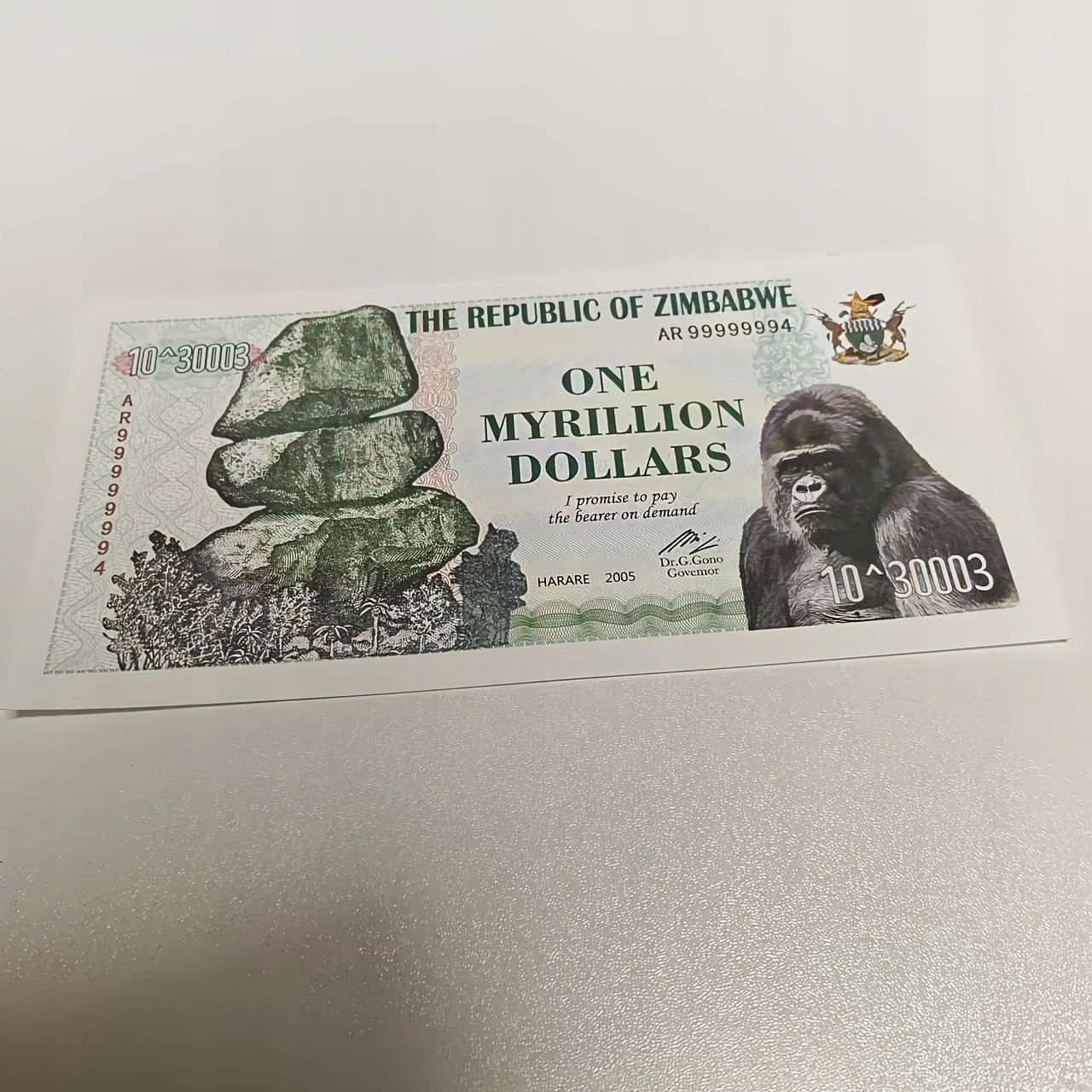 Oferuję unikalny banknot pochodzący z Republiki Zimbabwe, emitowany w okresie hiperinflacji, która miała miejsce w latach 2000-2009. Na awersie widnieje powtórzona nazwa państwa: THE REPUBLIC OF ZIMBABWE, a także intrygujący napis 1 MYRILLION Dolarów który prawdopodobnie nawiązuje do niezwykle wysokich nominałów charakterystycznych dla tamtego czasu (np. trylionów lub kwadryliów dolarów Zimbabwe).