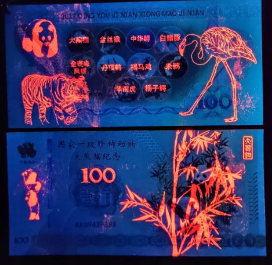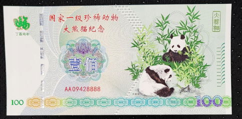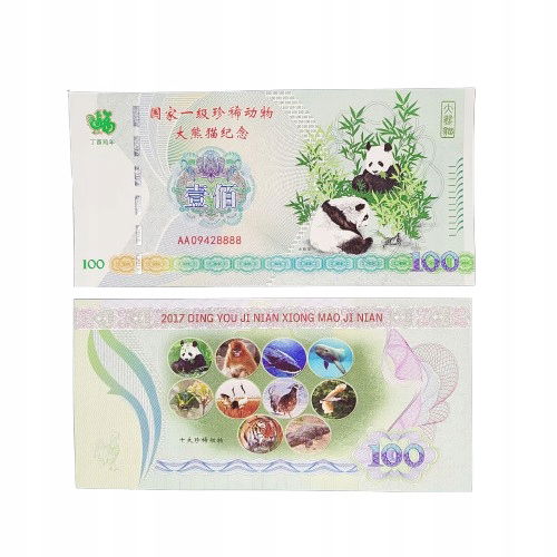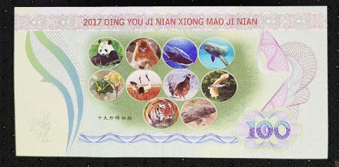 - Rewers (tył):W górnej części banknotu widnieje napis "2017 DING YOU JI NIAN XIONG MAO JI NIAN", co wskazuje na rok emisji (2017, chiński rok Ding You) oraz odnosi się do pamięci pandy.Centralną część rewersu zdobi kolaż okrągłych miniatur przedstawiających różne zwierzęta, co może symbolizować różnorodność chińskiej fauny lub inne chronione gatunki. Wśród nich można rozpoznać m.in. kolejne pandy, a także ptaki i zwierzęta wodne.Wartość nominalna "100" powtórzona w prawym dolnym rogu.Subtelne, abstrakcyjne motywy graficzne dopełniają kompozycję.