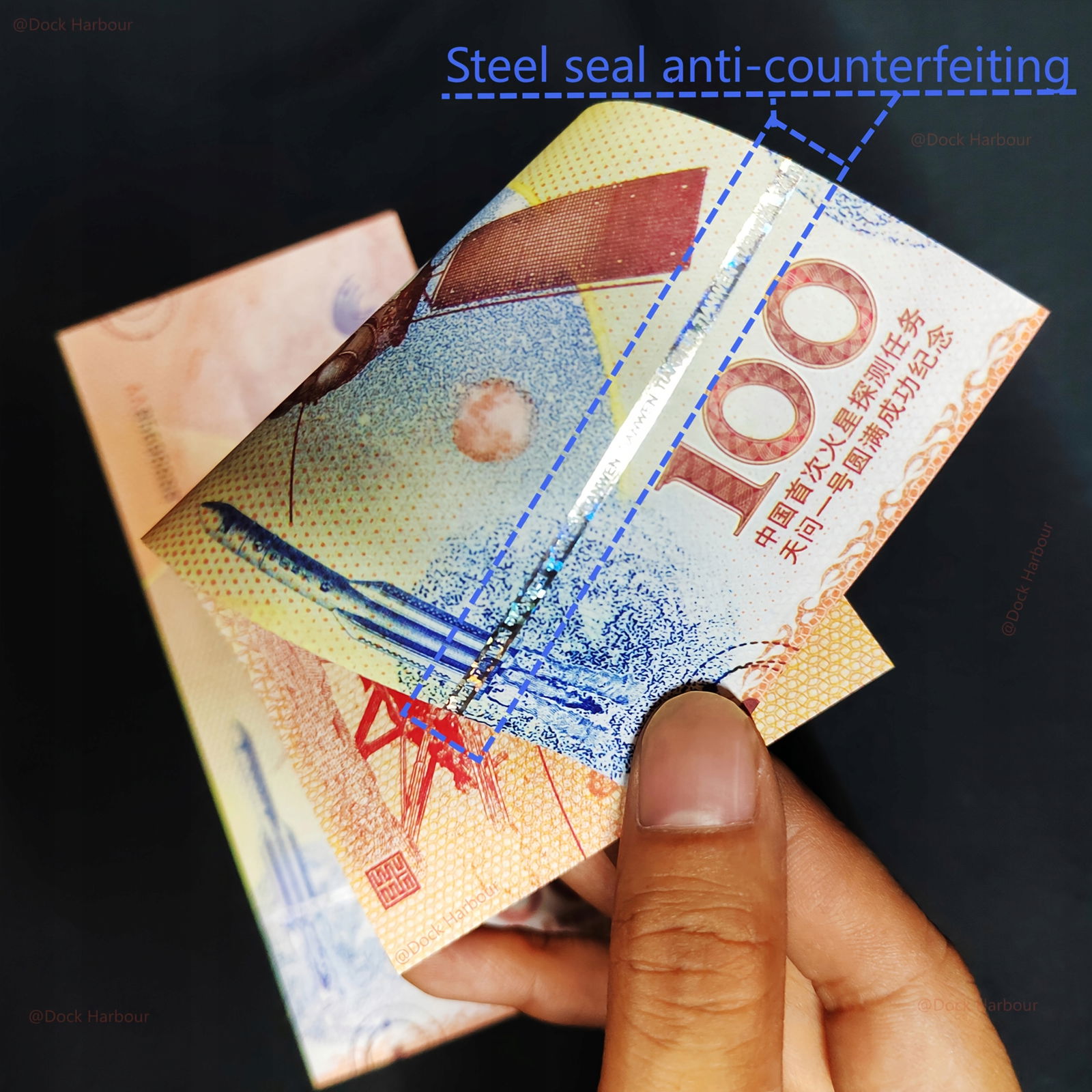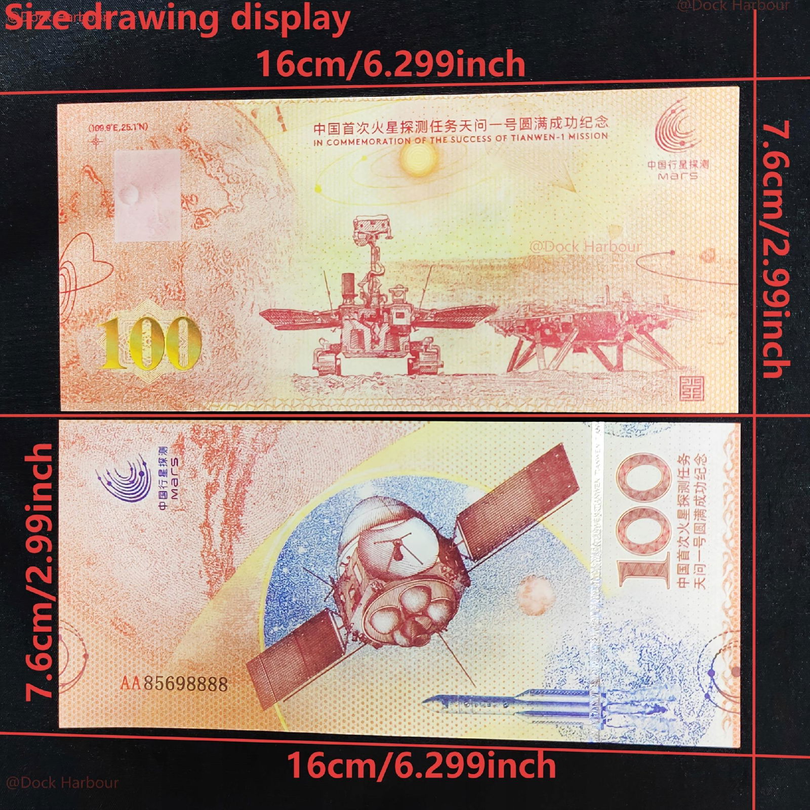 - Wzornictwo:Awers (strona z nominałem "100"): Przedstawia imponujący wizerunek łazika marsjańskiego Zhurong oraz platformy lądowniczej. W tle widoczne są stylizowane elementy graficzne nawiązujące do przestrzeni kosmicznej i Marsa. Napisy w języku chińskim informują o upamiętnieniu sukcesu misji Tianwen-1. W lewym górnym rogu symboliczne oznaczenie pozycji geograficznej (109.9°E, 25.1°N).Rewers (strona z nominałem "100"): Ukazuje szczegółowy wizerunek orbitera Tianwen-1, czyli sondy krążącej wokół Marsa. W tle widoczna jest planeta Mars oraz stylizowana orbita. W lewym dolnym rogu znajduje się unikalny numer seryjny. Napisy w języku chińskim również odnoszą się do misji.