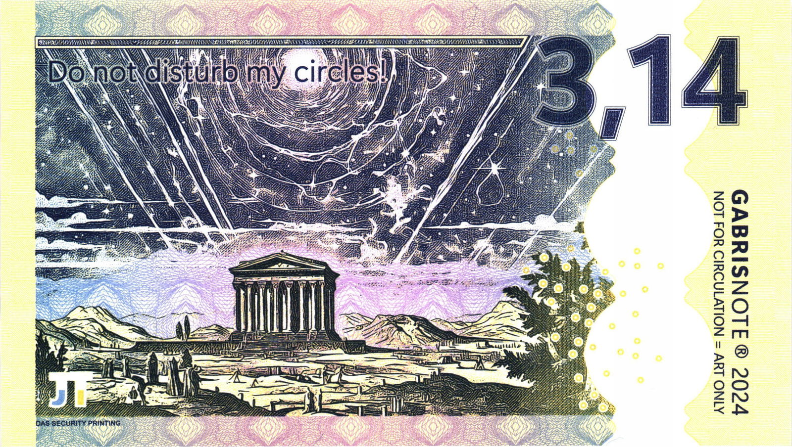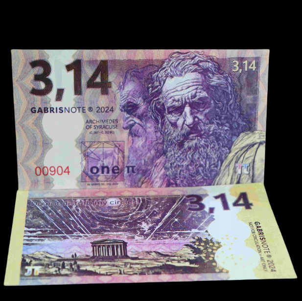 - Rewers (strona tylna):Wartość "3,14" powtórzona w prawym górnym rogu.Misterne tło przedstawiające klasyczną budowlę (prawdopodobnie świątynię lub teatr) osadzoną w nastrojowym, górzystym krajobrazie. Całość otoczona jest abstrakcyjnymi, geometrycznymi wzorami i liniami, które mogą symbolizować skomplikowane koncepcje matematyczne i mechanizmy wszechświata.Intrygujący napis w górnej części: "Do not ask for my circle..." (Nie pytaj o mój okrąg...), będący nawiązaniem do legendarnych słów Archimedesa.Powtórzone oznaczenie "GABRISNOTE 2024" oraz kluczowa informacja "NOT FOR CIRCULATION - ART ONLY".