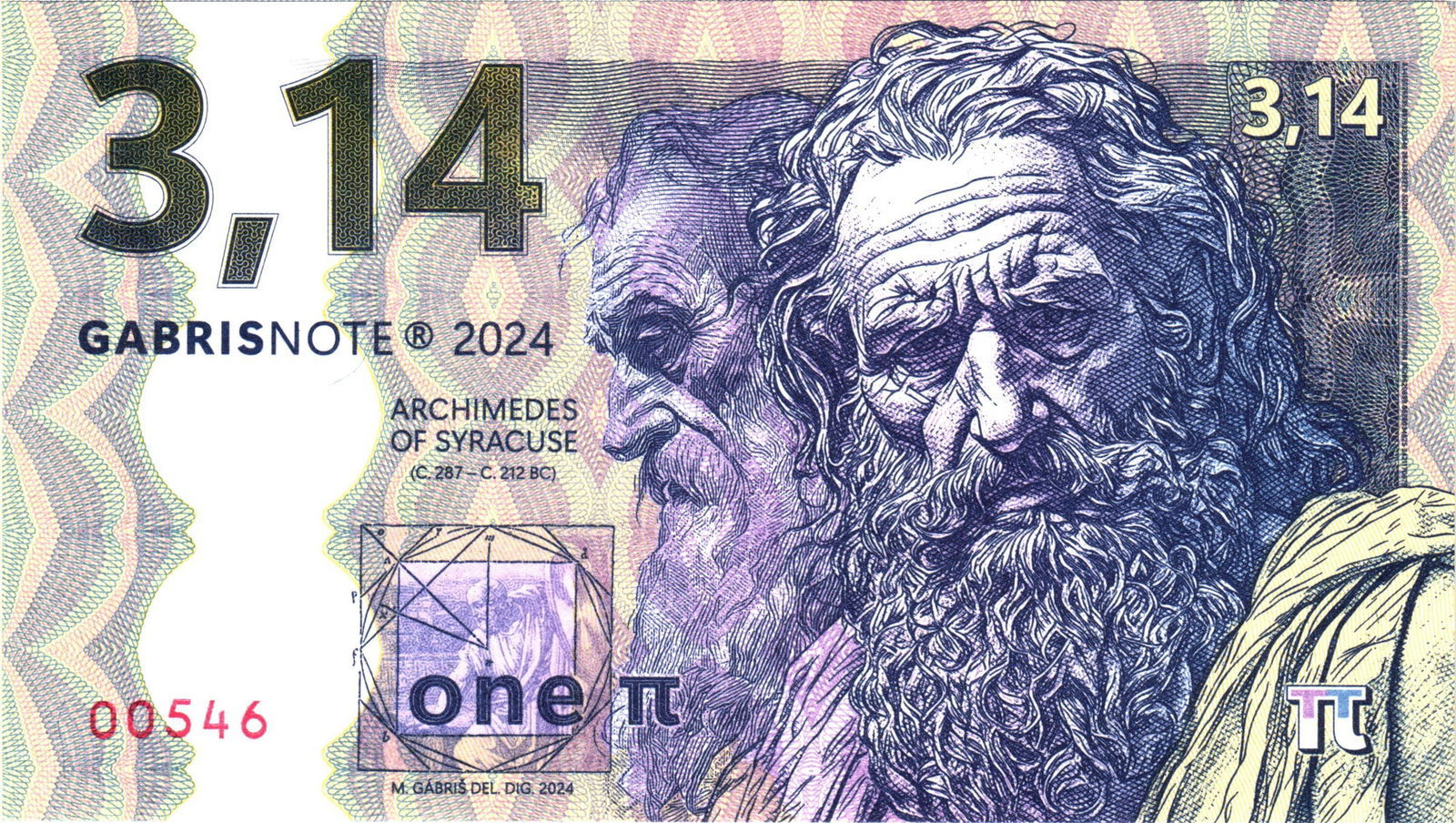 - Awers (strona przednia):Dominująca wartość "3,14" widoczna w górnych rogach oraz duża, stylizowana "3,14" po lewej stronie, jednoznacznie nawiązująca do przybliżonej wartości liczby Pi.Szczegółowy wizerunek Archimedesa z Syrakuz, przedstawionego z charakterystyczną, okazałą brodą i surowym, myślicielskim wyrazem twarzy. Obok niego, nieco w tle, widoczny jest drugi, subtelnie zarysowany portret.Napisy identyfikujące: "GABRISNOTE 2024" oraz "ARCHIMEDES OF SYRACUSE".Unikalny numer seryjny oraz oznaczenie nominału w formie słownej: "one π" (jeden Pi).