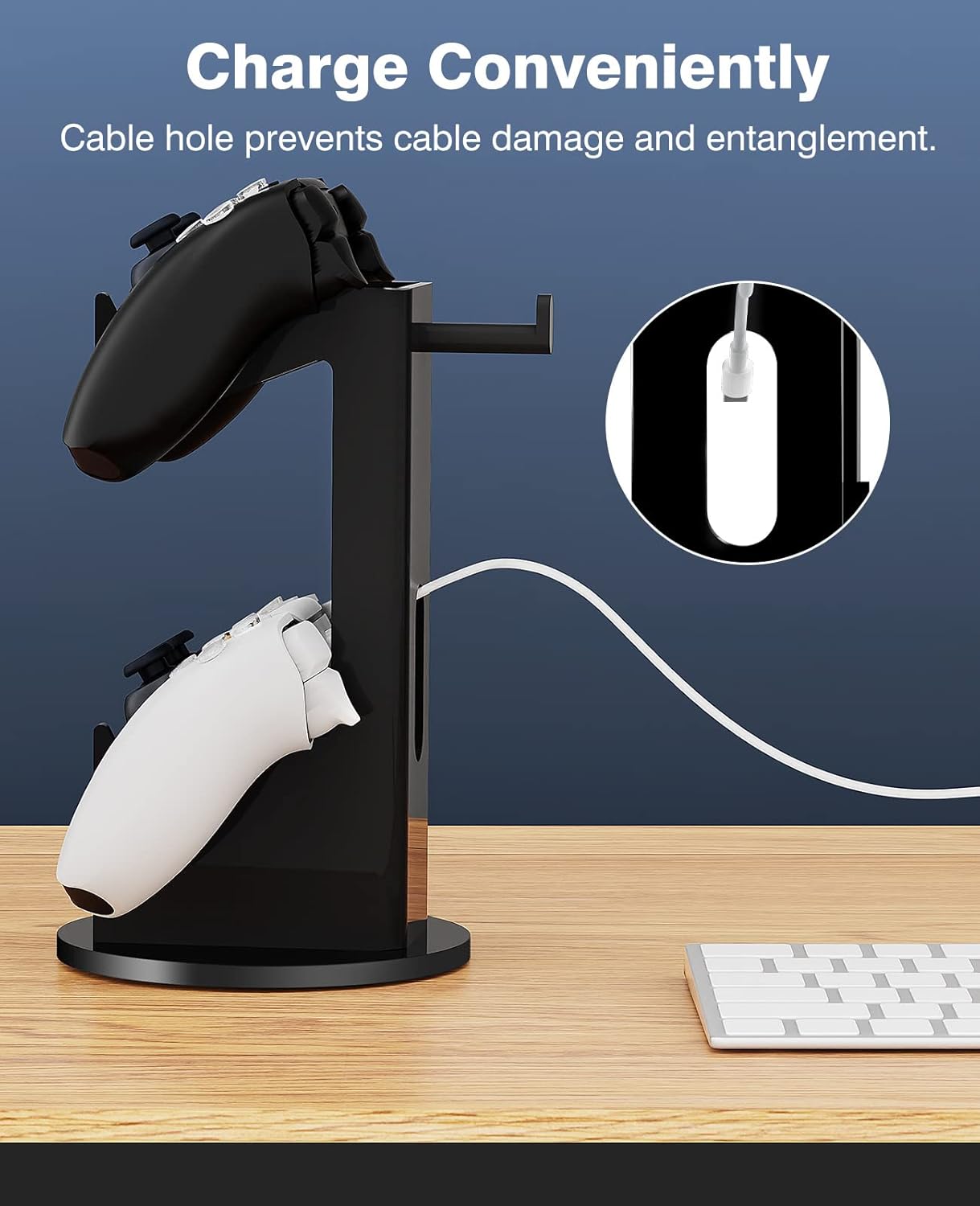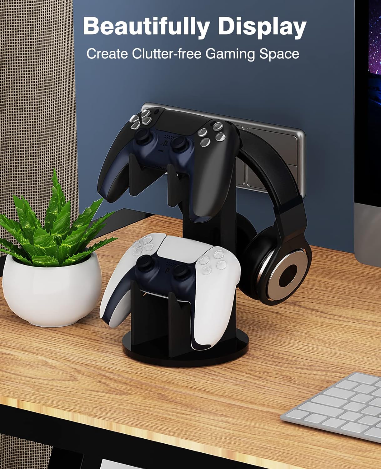 Dobrze zorganizowany: Ten stojak na kontroler pozwala na przechowywanie dwóch kontrolerów i pełnowymiarowego zestawu słuchawkowego, oszczędzając miejsce. Dzięki temu kontroler będzie uporządkowany, a pokój – uporządkowany.