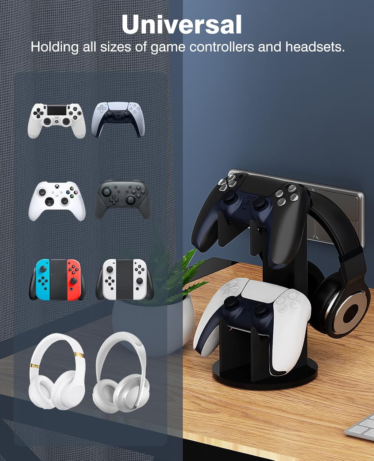 Dobra kompatybilność: Nasz uchwyt na kontroler idealnie pasuje do uniwersalnych gamepadów, takich jak PS4, PS5, PS4, Xbox One, Xbox Series X, Xbox 360 Switch, Steam, STEAM, Switch/Switch 2 itp. Ponadto stojak na słuchawki może pomieścić pełnowymiarowe słuchawki do gier.