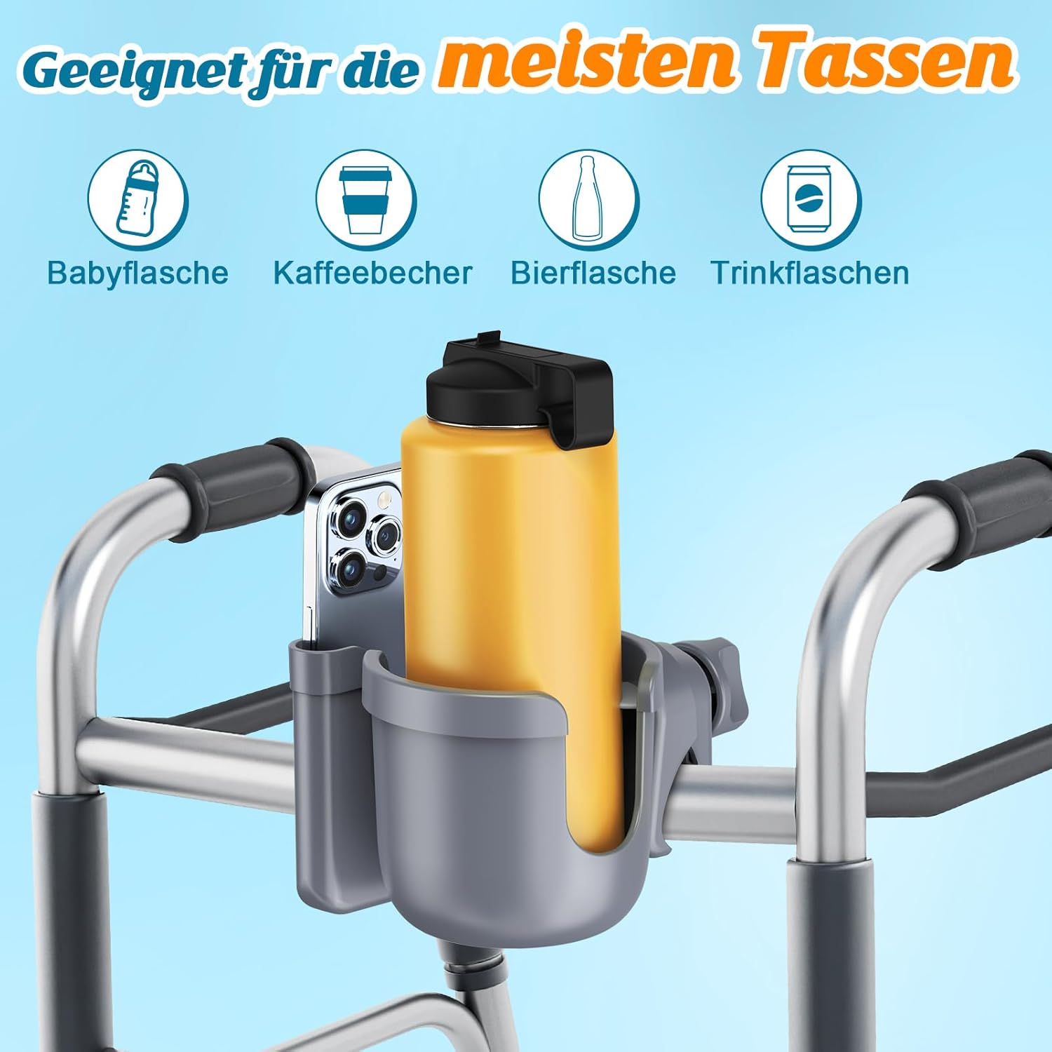 Uchwyt Guiseapue Universal 2-in-1 to praktyczne i funkcjonalne rozwiązanie, które łączy uchwyt na kubek oraz uchwyt na telefon w jednym, kompaktowym urządzeniu. Dzięki temu możesz mieć pod ręką napój i smartfon podczas spacerów, jazdy na rowerze, korzystania z wózka dziecięcego, wózka inwalidzkiego lub chodzika. Konstrukcja obracająca się o 360° pozwala ustawić uchwyt w dowolnym położeniu, zapewniając wygodę i łatwy dostęp do napoju oraz telefonu. Antypoślizgowe wkładki stabilizują kubek i chronią go przed wypadnięciem, nawet na nierównej nawierzchni. Uchwyt na telefon utrzymuje urządzenie stabilnie i pewnie, pasując do większości smartfonów. Montaż jest szybki i prosty – zacisk mocujący pasuje do różnych średnic rurek, dzięki czemu można go zamontować na większości wózków, rowerów i urządzeń mobilnych.