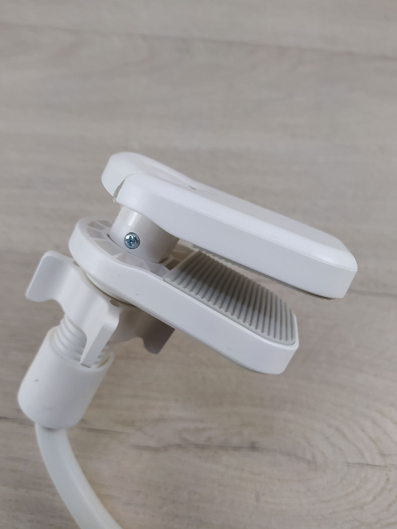 3. Montaż na łóżeczku: Przymocuj uchwyt do barierki łóżeczka, dokręcając zacisk. (Zaleca się montaż poza zasięgiem dziecka.)