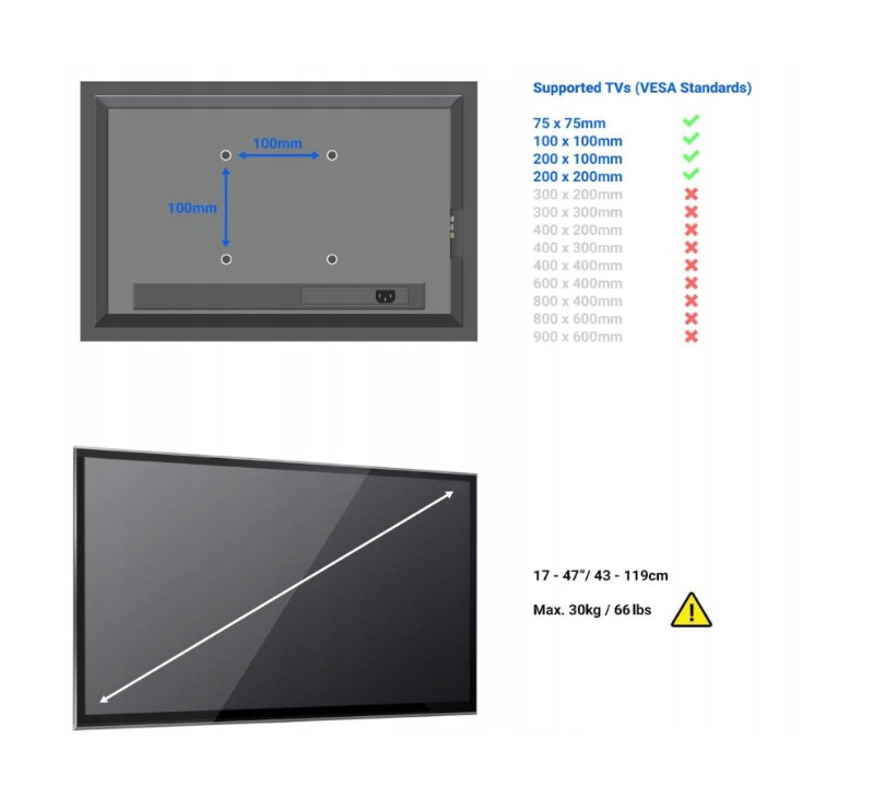 - ✴️Maksymalna zgodność dzięki standardom VESA (75x75, 100x100, 200x100, 200x200) // Nadaje się do ekranów o przekątnej 43 cm - 119 cm lub 17" - 47" // Maksymalne obciążenie 30 kg // Możliwość pochylenia -12° / +3°