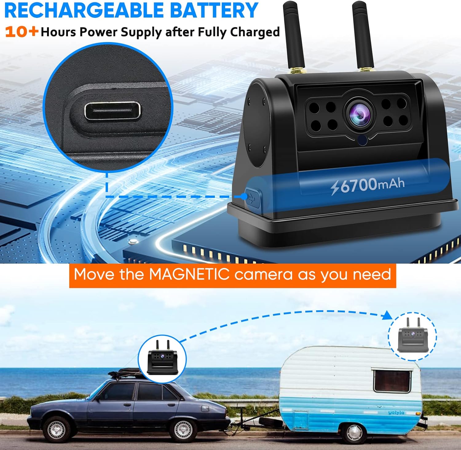 - Jednominutowa instalacja 100% BEZ KABLA bezprzewodowa kamera cofania z wbudowanym akumulatorem i MAGNETYCZNĄ podstawą! Duża pojemność baterii 6700 mAh obsługuje ciągłe użytkowanie przez ponad 10 godzin, silny magnetyczny sposób mocowania BEZ wiercenia jakiegokolwiek otworu pozwala na zmianę pozycji zgodnie z potrzebami. Nie są wymagane żadne profesjonalne umiejętności instalacyjne.