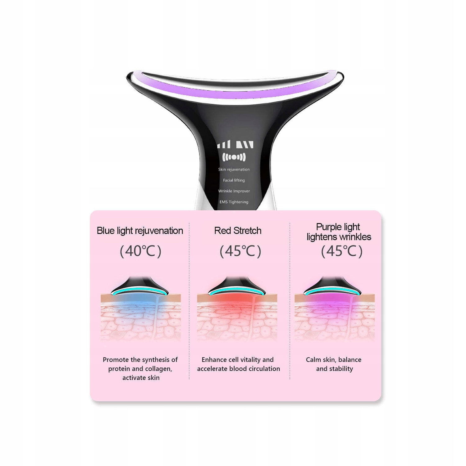 Temperatura urządzenia Anti-Aging Facial Device wynosi 45°C, co stymuluje krążenie krwi, wzrost fibroblastów i kolagenu, przyspiesza wchłanianie składników odżywczych i usuwa produkty przemiany materii. Poprawia wygląd drobnych linii, zmarszczek, obwisania skóry, melaniny i blizn.