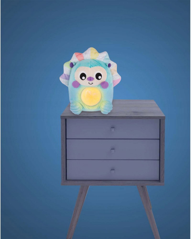 2. „ Różowy szum ” – który przypomina dźwięki w łonie matki i w naturalny sposób uspokaja dziecko. Brzuch świeci delikatnie na żółto